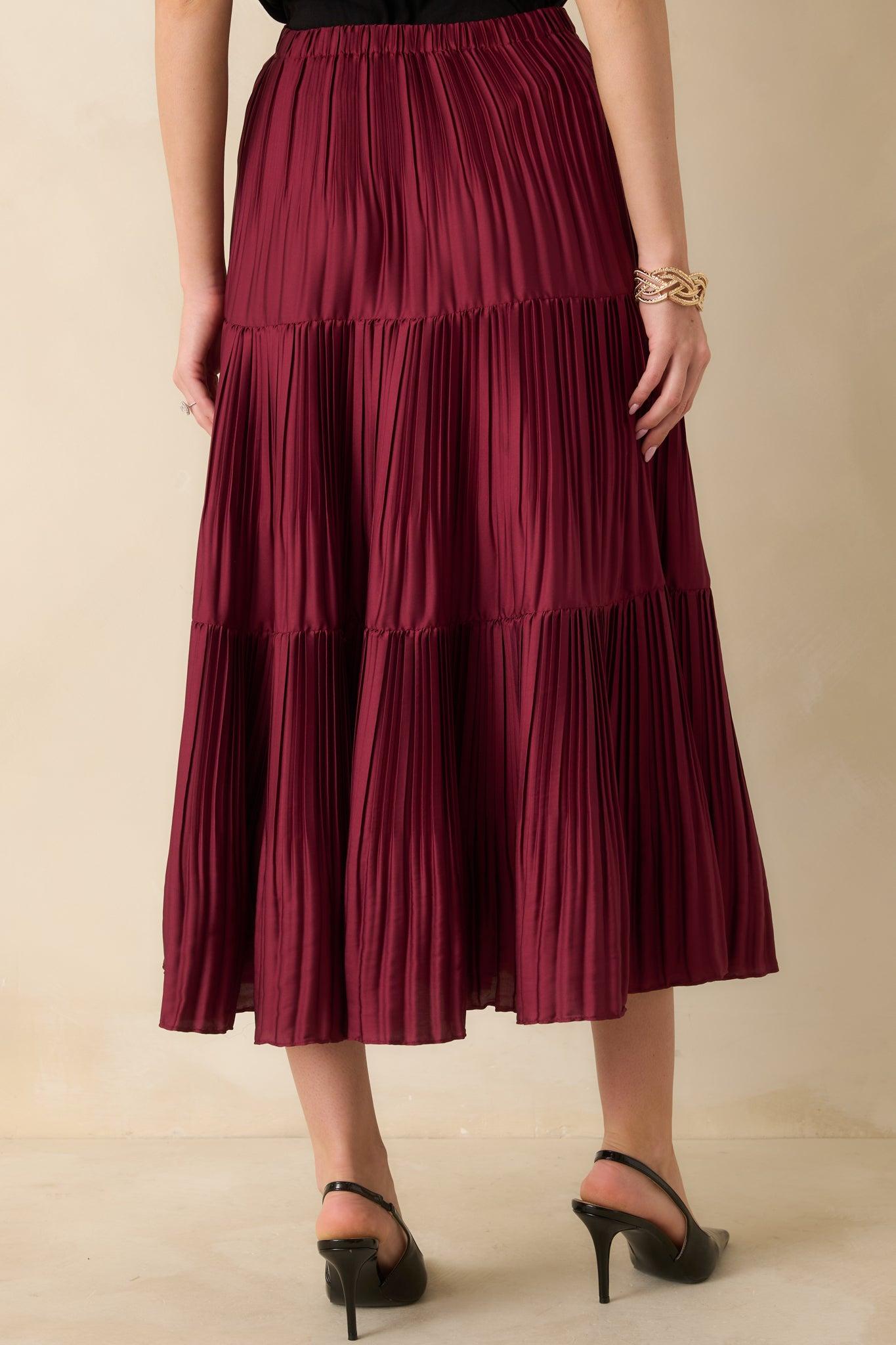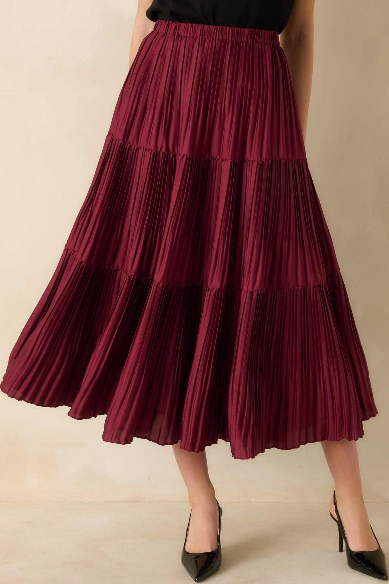 The moment you slip it on, you just know. This Feels Right Burgundy Tiered Pleated Midi Skirt moves with an easy elegance — tiered pleats that sway and float with every step. Rich burgundy gives it that dressed-up-but-still-effortless charm, whether you’re twirling through a holiday party or heading out for a candlelit dinner. Chic, confident, and made for those “I look amazing” moments. This burgundy tiered pleated midi skirt is constructed with lightweight woven fabric, featuring a flowy A-line silhouette and is pull-on style with elastic waistband. 100% Polyester Unlined Gentle Cycle Cold Manufactured in China Designed in The USA Model is 5'8" and Wearing a Size X-Small