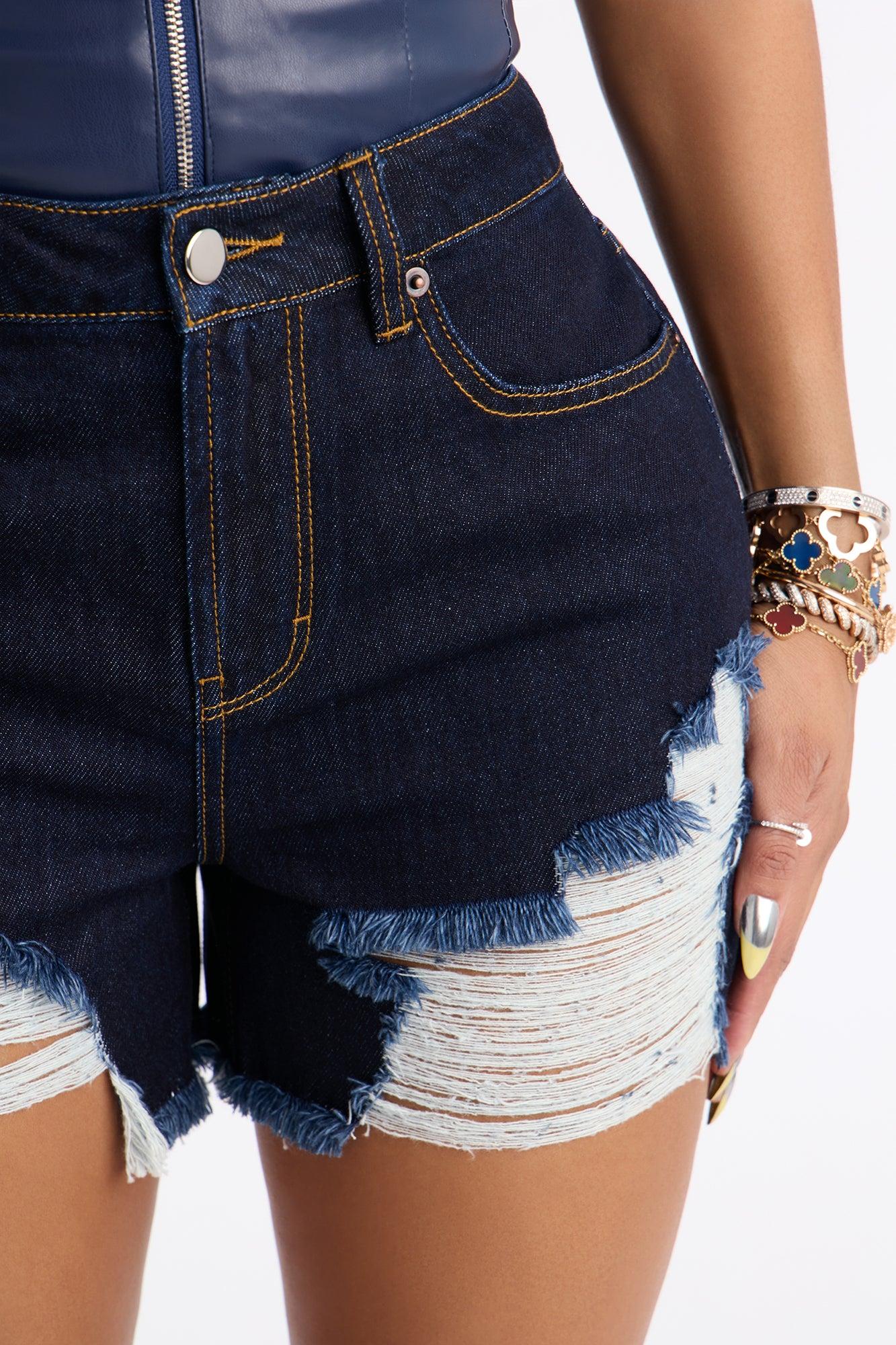 Available In Dark Wash. Denim Short 5 Pocket Ripped Raw Hem 11.5" High Rise 3.5" Inseam Non Stretch Disclaimer: Due To The Specialized Wash, Each Garment Is Unique. 100% Cotton Imported