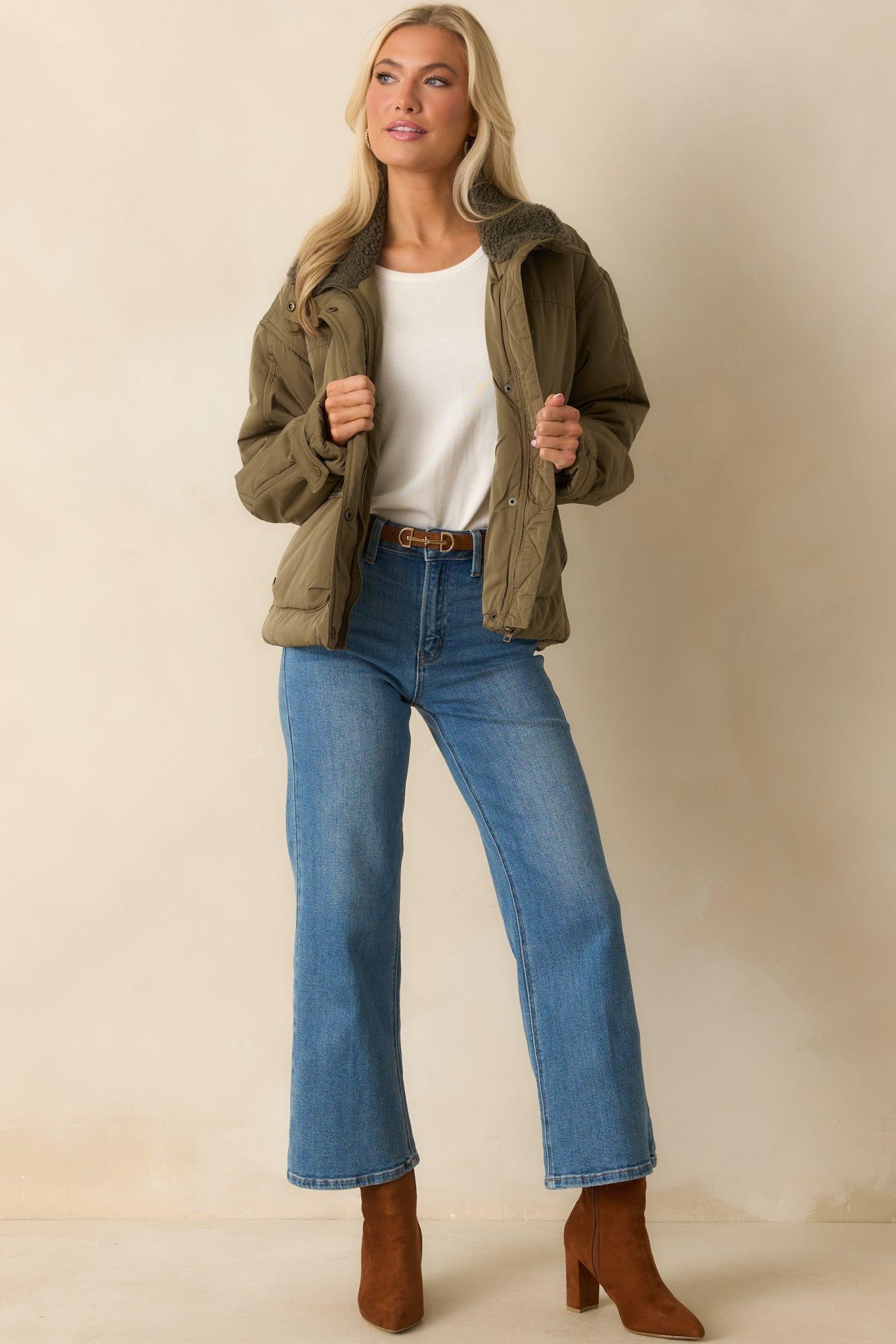 The Thread & Supply Army Green Danya Jacket keeps things comfy and cute, an easy layer that adds effortless style to everyday looks. This army green puffer jacket features a sherpa-lined spread collar, a front zip and snap button placket, long sleeves with snap button cuffs, functional patch pockets, and a relaxed, slightly boxy fit. 100% Polyester Lining: 100% Polyester Machine Wash Cold Manufactured in China Designed in the USA Model is 5'8" and wearing size small