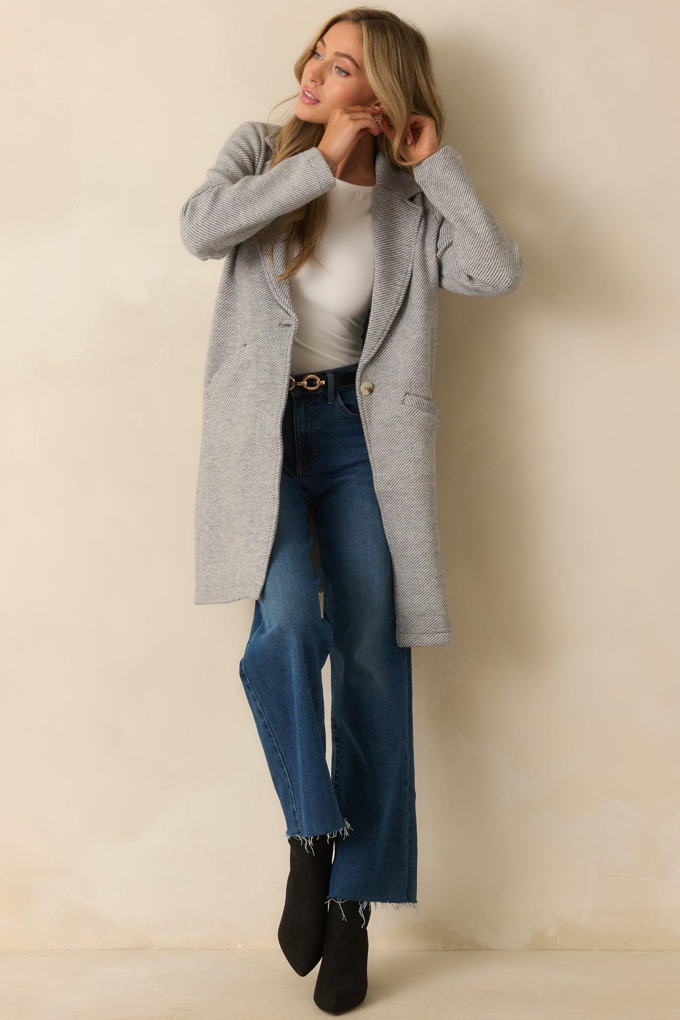 The Thread & Supply Heather Grey Kenzie Coat blends cozy warmth with everyday style, a polished layer that feels just as good as it looks. This grey twill coat features a notched lapel collar, single-breasted front with functional button closure, long sleeves, functional front welt pockets, and a straight longline silhouette. 30% Nylon, 25% Polyester, 24% Acrylic, 18% Cashmere, & 3% Wool Unlined Hand Wash Cold Manufactured in China Designed in the USA Model is 5'8" and wearing size small