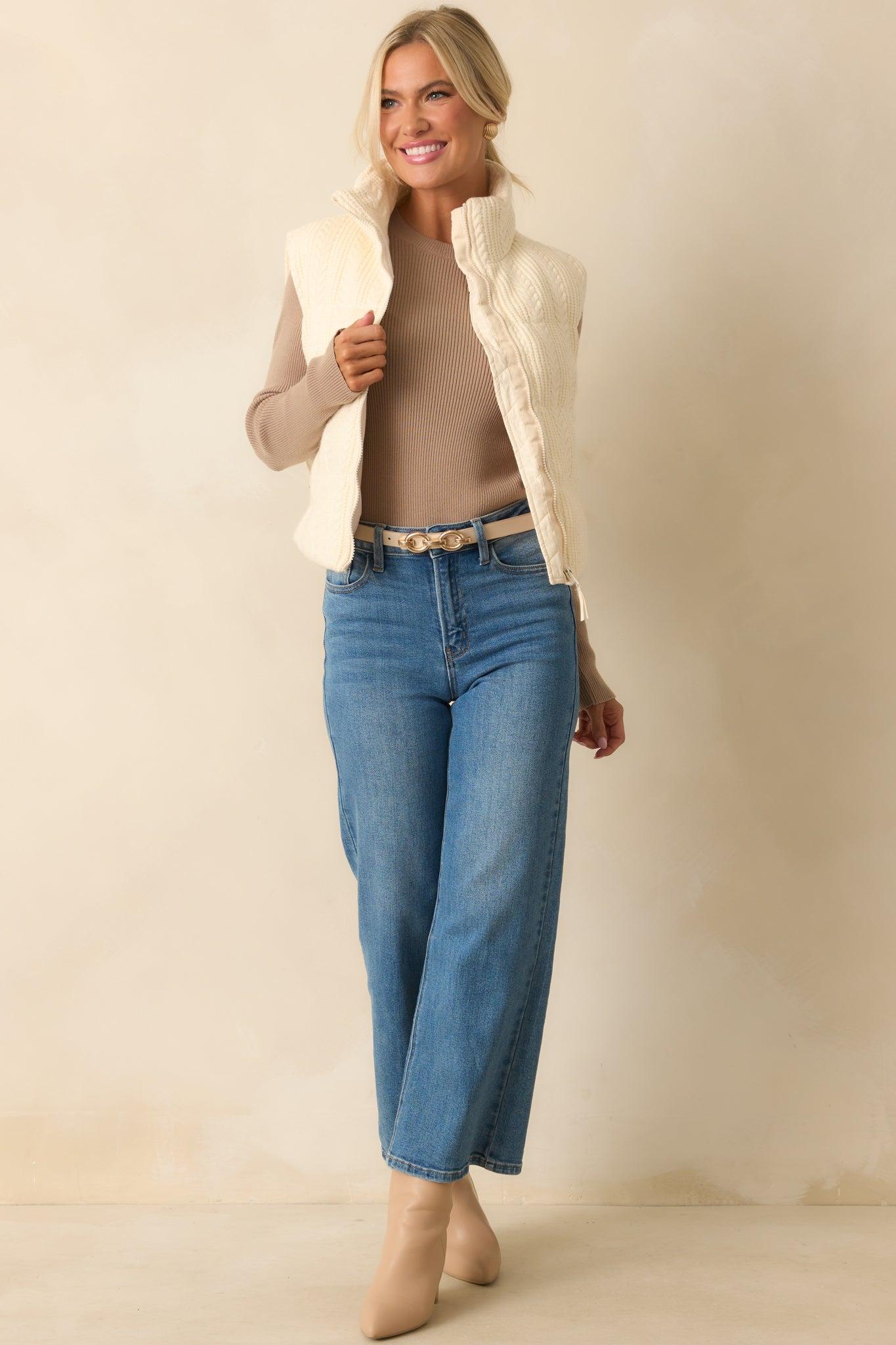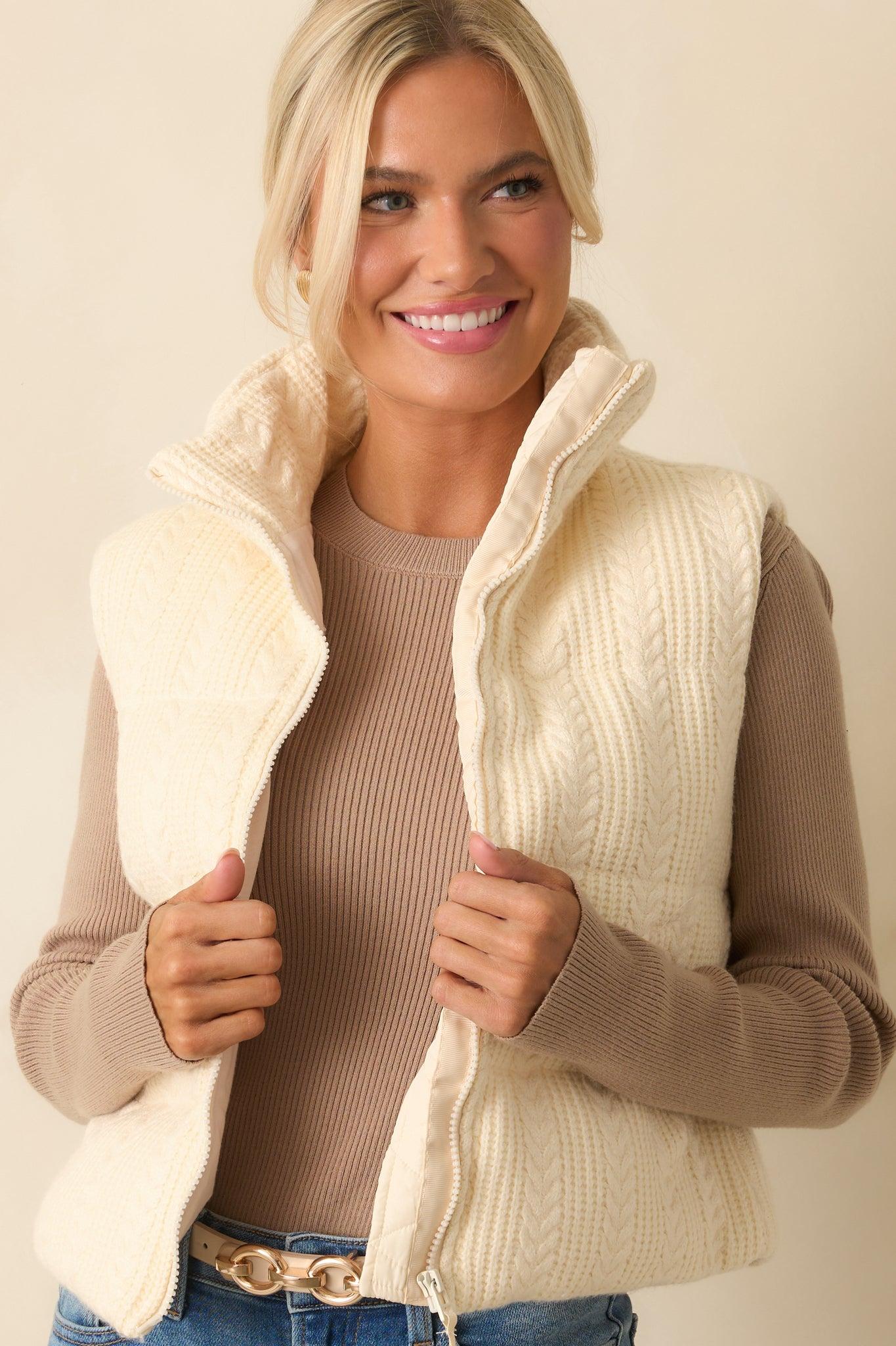 The It Comes Down To This Ivory Cable Knit Puffer Vest is the piece that makes it all come together, easy and effortless every time, always giving your look the perfect finishing touch. This ivory puffer vest features a quilted cable knit exterior, high stand collar, sleeveless, a lightly padded body with a smooth interior lining, functional full zip front, and functional pockets. 51% Rayon, 30% Polyester, & 19% Nylon Lined: 65% Polyester & 35% Rayon Dry Clean Only Manufactured in China Designed in The USA Model is 5'6" and Wearing a Size Small