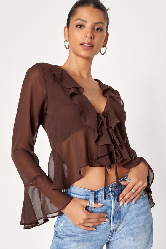 We're totally crushing on the retro cuteness of the Lulus Thriving Flirt Brown Chiffon Ruffled Long Sleeve Tie-Front Top! Airy woven chiffon shapes this adorable top that has long sleeves with flared cuffs and a darted bodice with a ruffle-trimmed V-neckline. Two slender ties secure at the front, atop a cropped and ruffled hem that adds a perfect Y2K vibe!