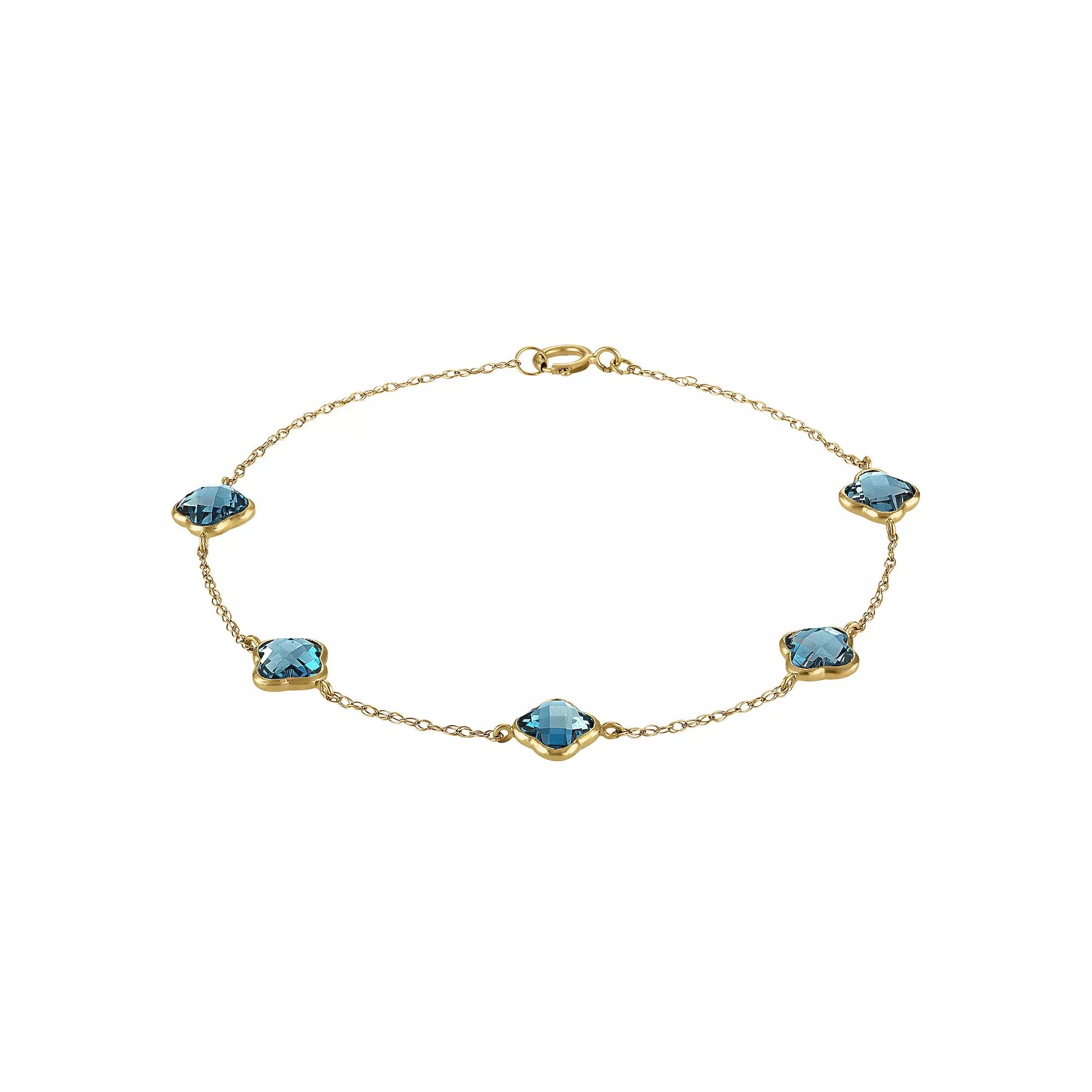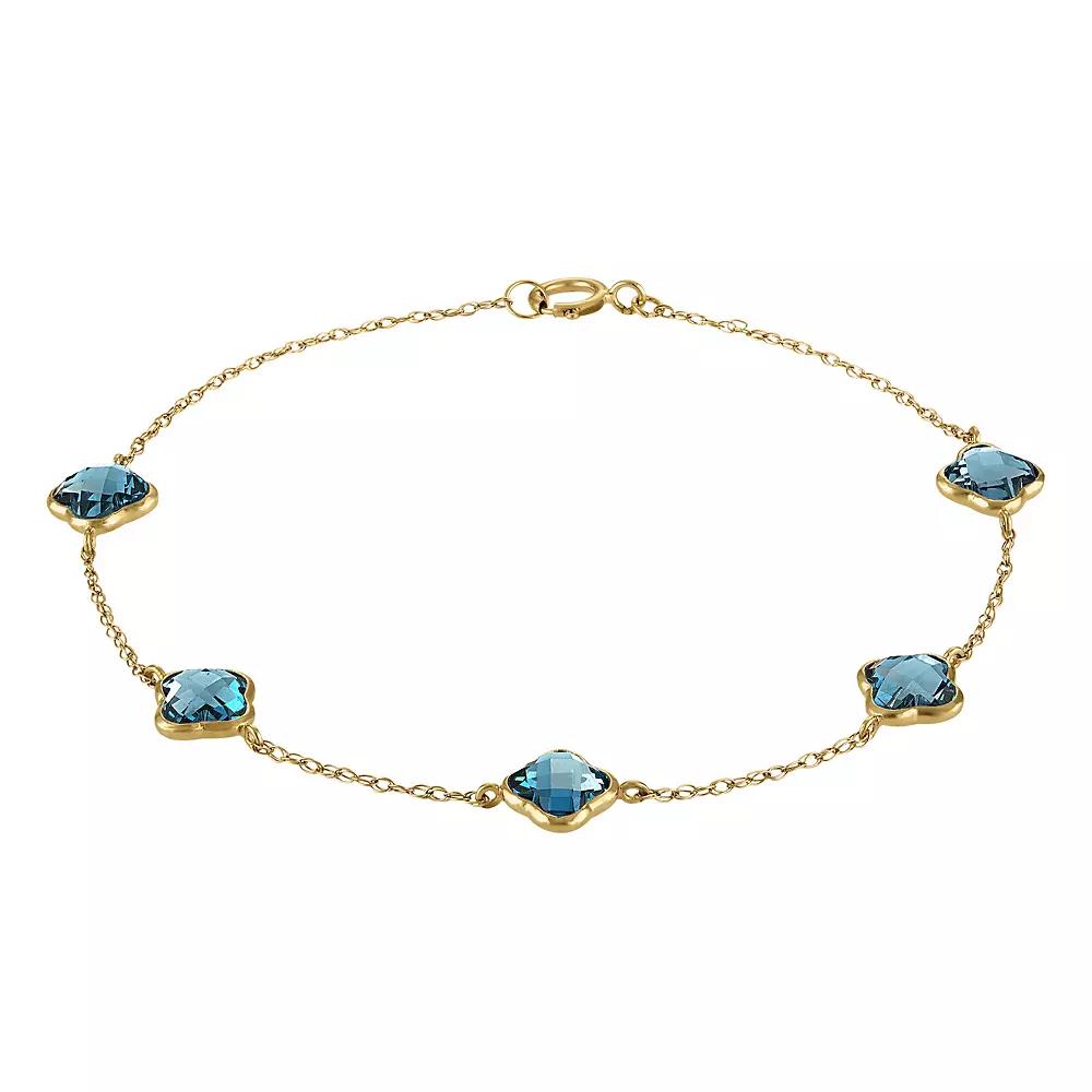Add a touch of sparkle to your ensemble with this 10k gold Tiara clover-cut gemstone station bracelet. Click on this JEWELRY & WATCHES GUIDE to learn about fit, styles, materials and more! Add a touch of sparkle to your ensemble with this 10k gold Tiara clover-cut gemstone station bracelet. Click on this JEWELRY & WATCHES GUIDE to learn about fit, styles, materials and more! FEATURES Length: 7.25 in. Clasp: spring-ring Nickel free Metal: 10k gold Finish: polished Packaging: boxed ImportedSTONE DETAILS Total weight: 2 1/2 ct. Center stone weight: 1/2 ct. Shape: clover cut Setting: bezel Gemstones may have been treated to enhance their appearance. Special care may be required. Please visit our Gemstone Treatment & Special Care Guide for more information. Size: 7.25. Color: Blue Topaz. Gender: female. Age Group: adult.