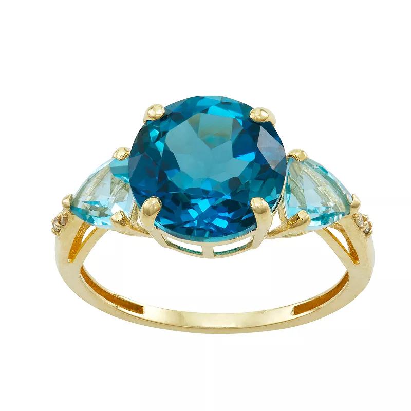 Add color and brilliance to your look with this stunning blue topaz ring adorned by side stones and diamonds. Metal: 10k gold Packaging: boxed Width: 10 mm Finish: polishedSTONE DETAILS Total weight: 4 1/2 ct. Center stone weight: 3 5/8 ct. Center stone size: 10 mm Shape: round Setting: paveDIAMOND DETAILS Total weight: less than 1/10 ct. Shape: round Setting: prong Diamond weights are approximate. Diamond Total Weights may vary between .01 and .13 ct. Some diamonds consist of fewer than 17 facets. Gemstones may have been treated to enhance their appearance. Special care may be required. Please visit our Gemstone Treatment & Special Care Guide for more information. Image(s) may be enlarged to show detail. Please note, due to the high value of this item, a signature may be required upon delivery. Gender: female. Age Group: adult.