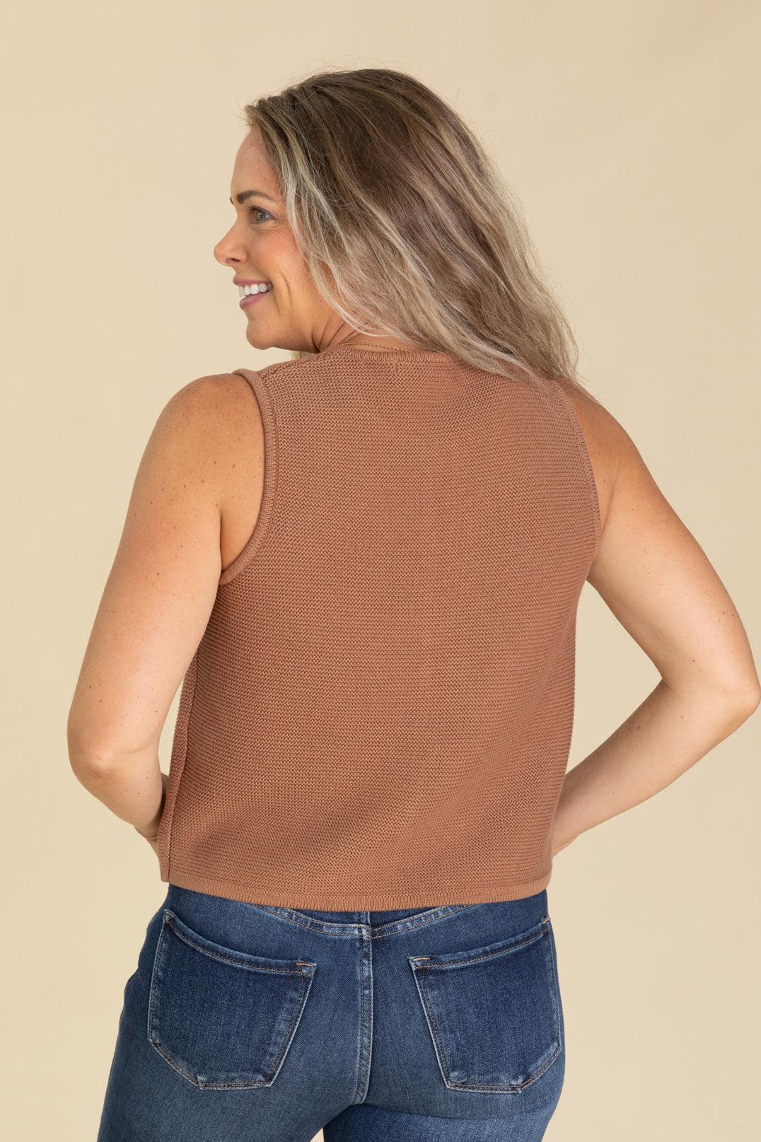 Product Details Colors: Deep Camel/ Dark Green Print: Solid Neckline: Tie Front Sleeve: Sleeveless Hemline: Straight Brand: Zenana Material and Care 100% Cotton Machine Wash Cold Hang/Line Dry Size and Fit Small: Bust 38" Waist 38" Length 18" Medium: Bust 40" Waist 40" Length 18.5" Large: Bust 42" Waist 42" Length 19" Erica is 5’7” and wearing her true size small
