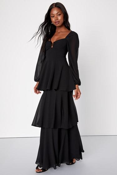 Prepare for so many magical memories when you're wearing the Lulus Tier to Enchant Black Long Sleeve Tiered Maxi Dress! This sweet chiffon dress features a notched sweetheart neckline (with trendy U-bar support) and a slightly gathered bodice, all framed by long balloon sleeves with elasticized shoulders and cuffs. Set-in waist sits atop a cascading maxi skirt with flouncy tiers. Hidden back zipper/clasp.