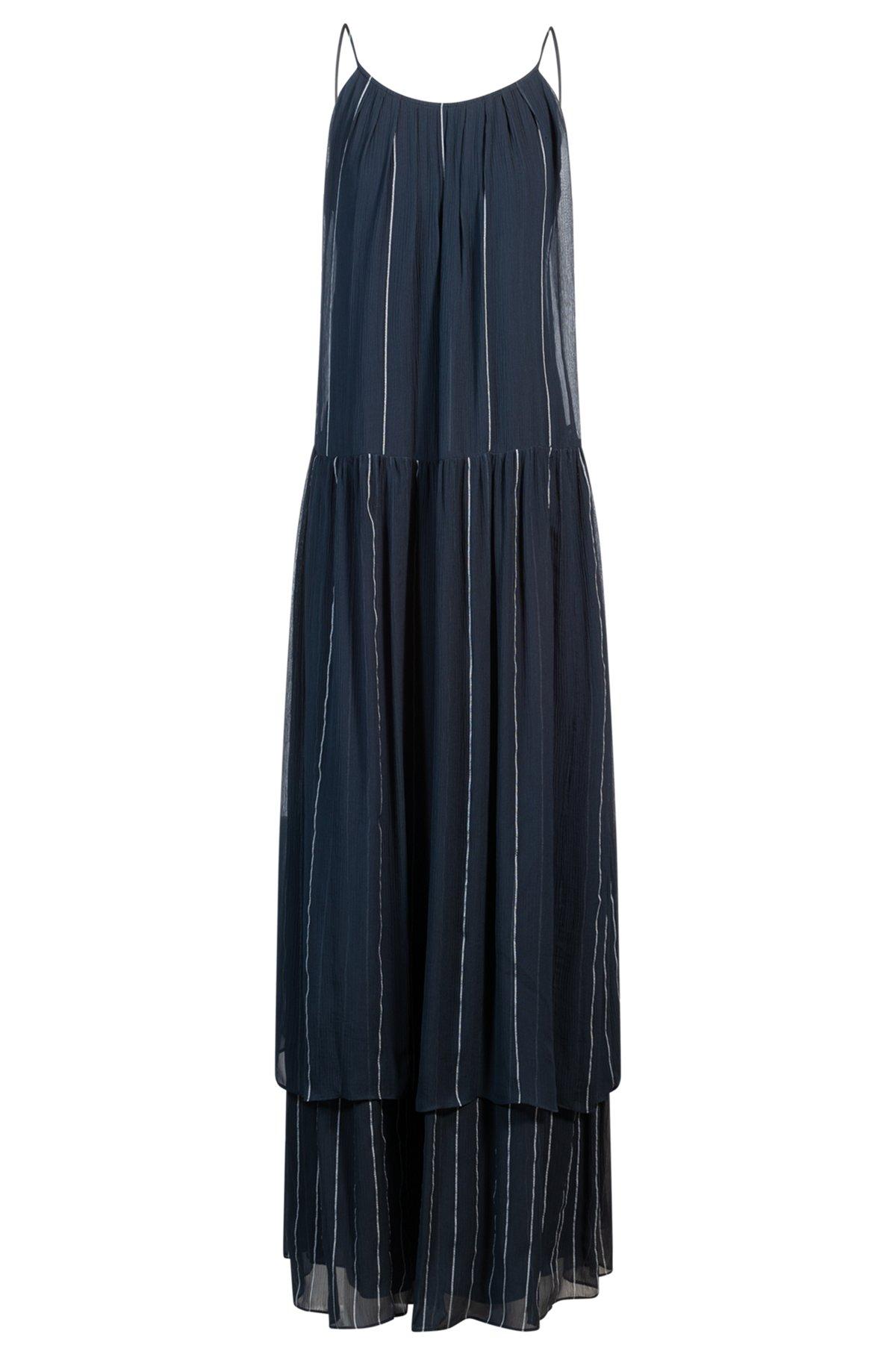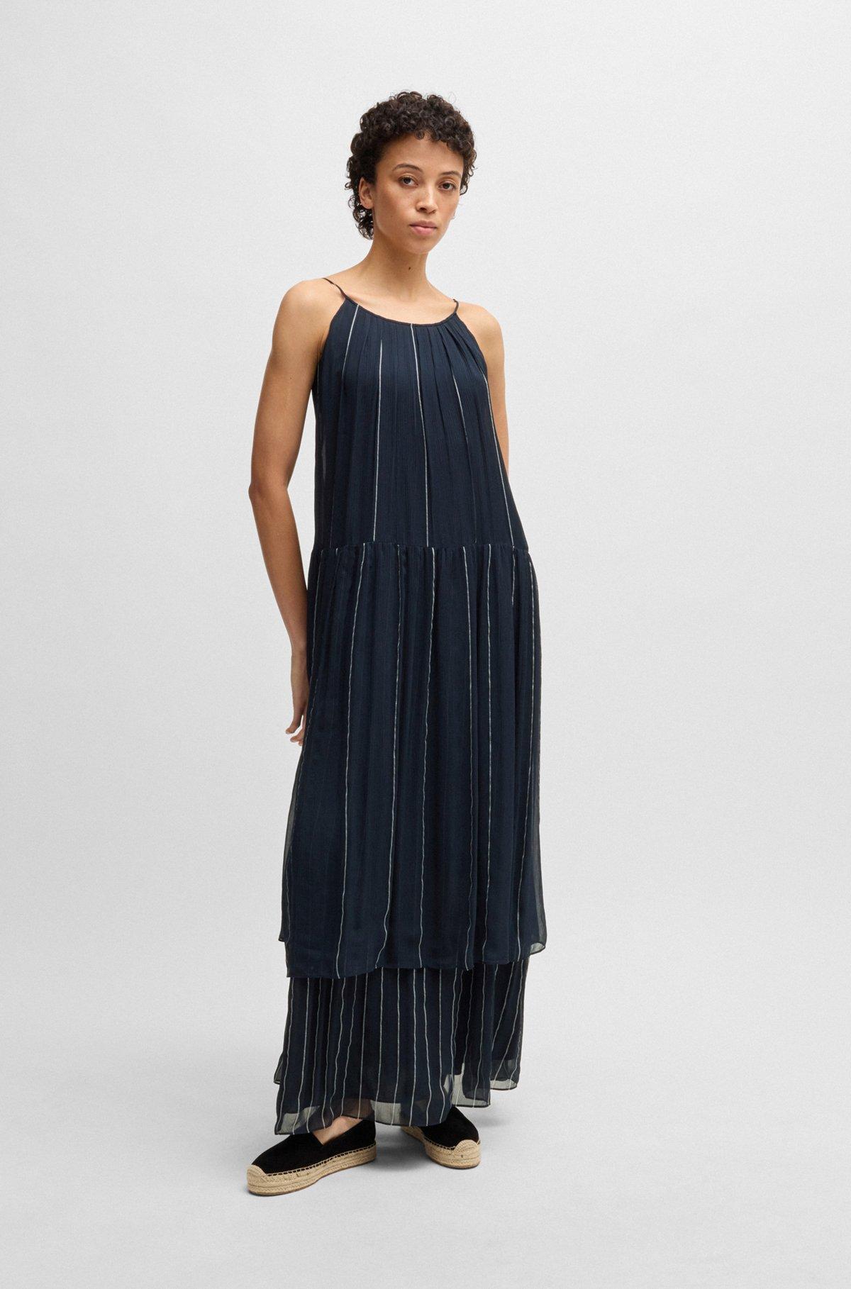 Tying at the back for an elegant look, this BOSS Womenswear dress delivers effortless summer style. The soft fabric is blended with silk for a luxurious feel and a fluid drape, while tiering and layering create floaty movement. A modern vertical stripe adds a sophisticated finish.