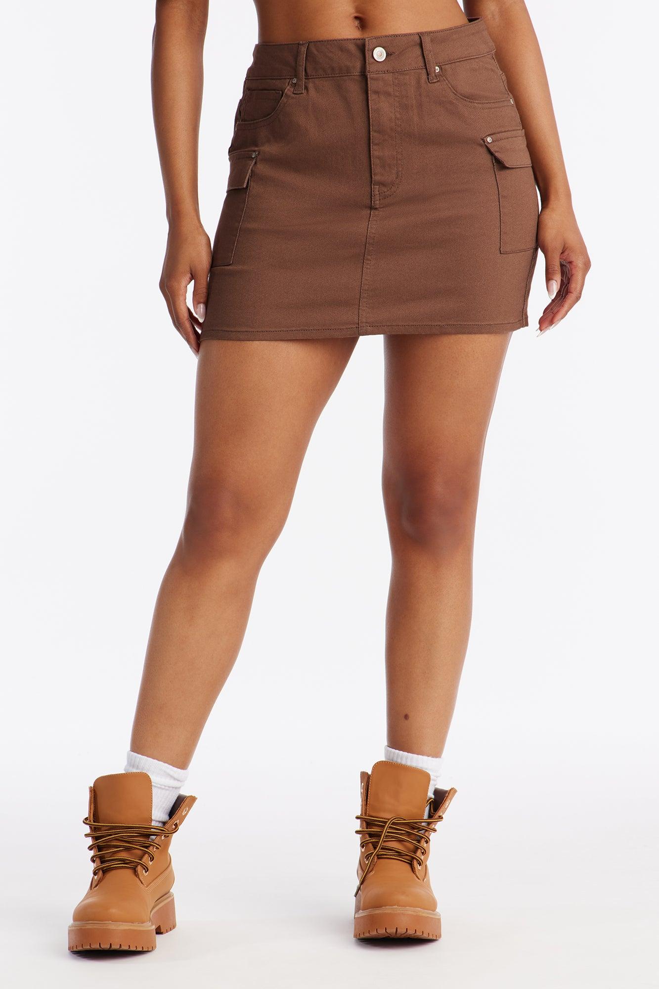 Available In Black And Chestnut. Mini Skirt Button and Zipper Closure Cargo & Utility Pockets Twill Stretch 13.5" Length Self: 67% Cotton 27% Polyester 3% Viscose 3% Spandex Imported California Proposition 65WARNING: Cancer and Reproductive Harm - www.P65Warnings.ca.gov.