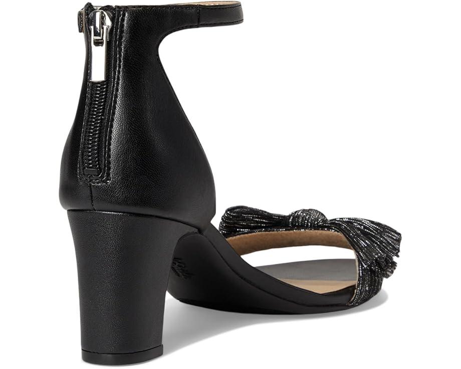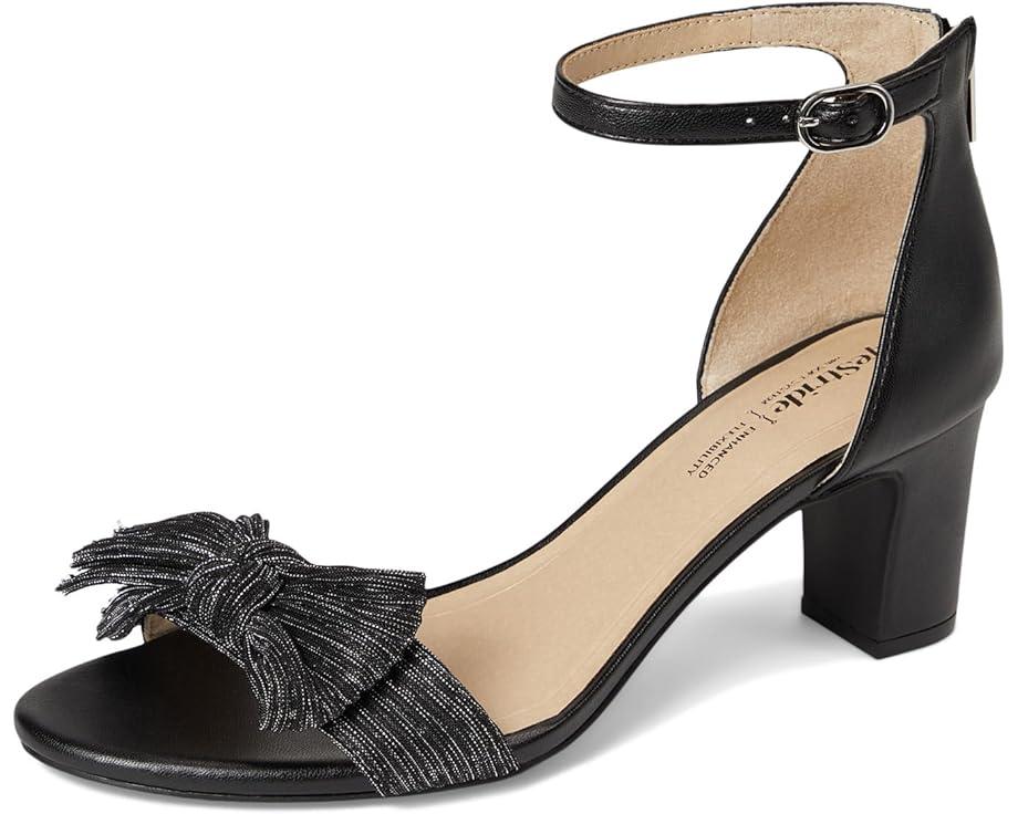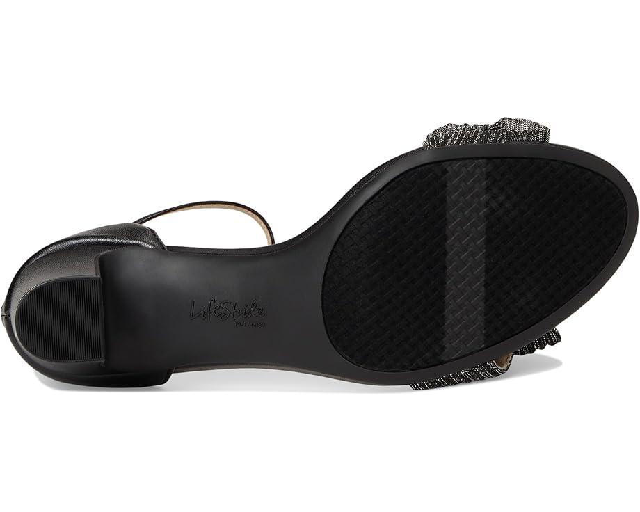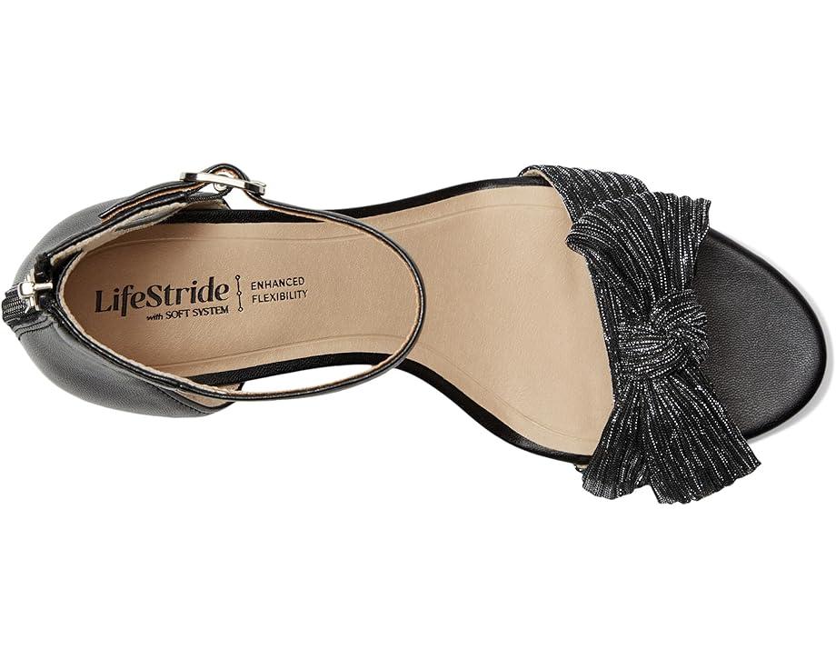 So chic, so flexible. The LifeStride® Florence Bow sandals with a feminine bow detail look and feel effortless. These heeled sandals are designed with a faux leather upper, an open round toe design, an ankle strap with an adjustable metallic buckle and built-in stretch, and feminine pleated bow detail. The zippered back closure ensures easy wear. These chic sandals are made of a foam insole and partially recycled polyurethane lining. They offer enhanced flexibility with ultra-flexible, padded block heels for easy movement. The trusted Soft System® comfort technology provides unmatched cushion, support, and flexibility.