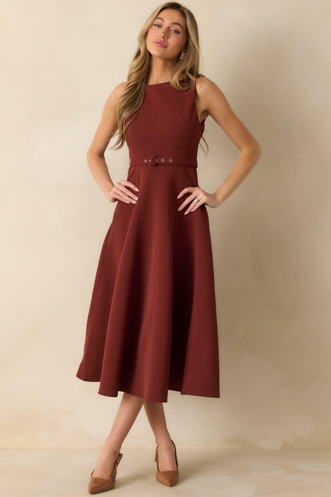 The Timely Matter Dark Rust Red Belted Sleeveless Midi Dress is the definition of understated elegance. With its tailored bodice, belted waist, and sweeping A-line skirt, it creates a silhouette that’s refined yet modern. Polished from every angle, it’s the kind of piece that feels right for every occasion, perfectly balanced between structure and grace. This dark rust red sleeveless midi dress features a fitted bodice with seamed detailing, a matching adjustable belt at the waist, a concealed back zip closure, and a flared A-line skirt for a flattering silhouette. 100% Polyester Unlined Hand Wash Cold Manufactured in China Designed in The USA Model is 5'8" and Wearing a Size Small, Clipped, Model is a True X-Small