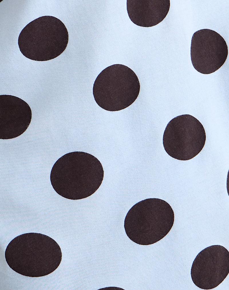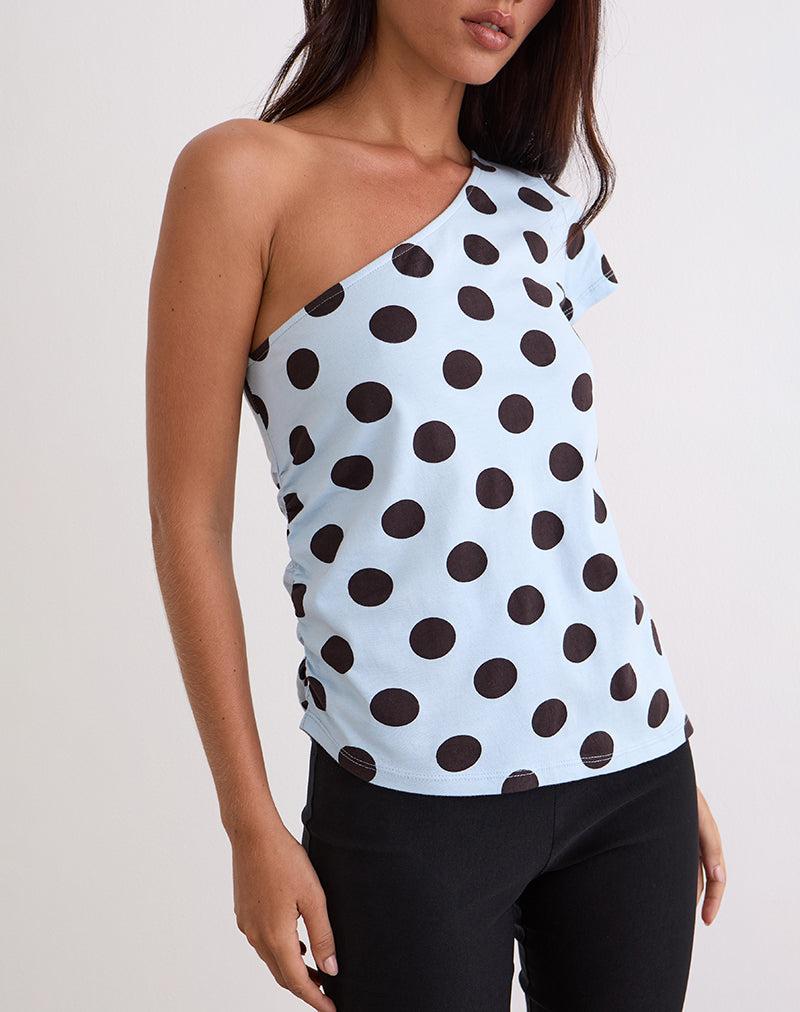 In a blue base with large brown polka print, the Tokiwa top features a slouchy fit with an asymmetrical one-shoulder neckline and one short sleeve. Keep it classy by pairing with our Asla capris. MODEL WEARS SIZE: EXTRA SMALL - MODEL HEIGHT:5'7