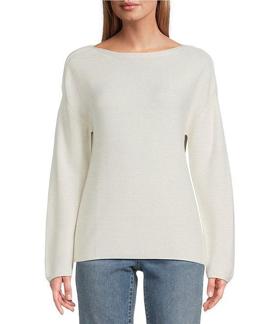 From Tommy Bahama, this sweater features: Link stitch fabrication Bateau neck Long sleeves Sequin embellishments Straight hemline Pullover construction Approx. 24" length Cotton/viscose/polyester/metallic Hand wash/reshape dry flat Imported.