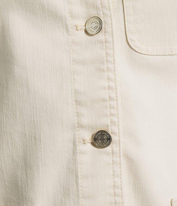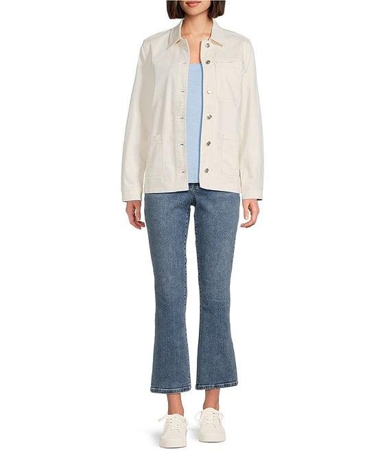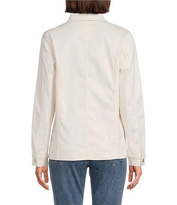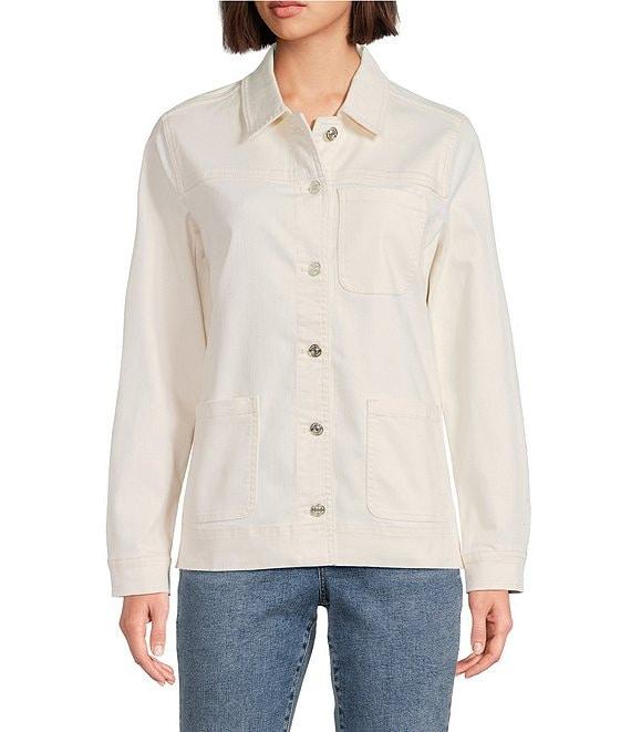 From Tommy Bahama, this jacket features: Solid dyed natural twill denim fabrication Chore coat silhouette Point collar Long sleeves 1 chest and 2 hemline front patch functional pockets Front button closure Approx. 26" length Cotton/recycled polyester/Lycra /spandex Machine wash cold/tumble dry low Imported.