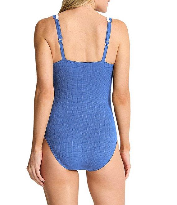 From Tommy Bahama, this one piece swimsuit features: Texture fabrication Tank silhouette Square neckline Molded cups Adjustable straps Tie front detail Tummy control Full coverage Lined Pull-on construction Recycled nylon/spandex Hand wash Imported.