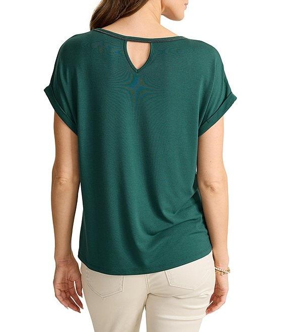 From Tommy Bahama, this tee features: Knit fabrication Crew neckline Rolled short sleeves Beaded embellished neckline Keyhole cutout in the back Pullover construction Approx. 25" length Tencel modal/polyester/spandex Machine wash cold/tumble dry low Imported.