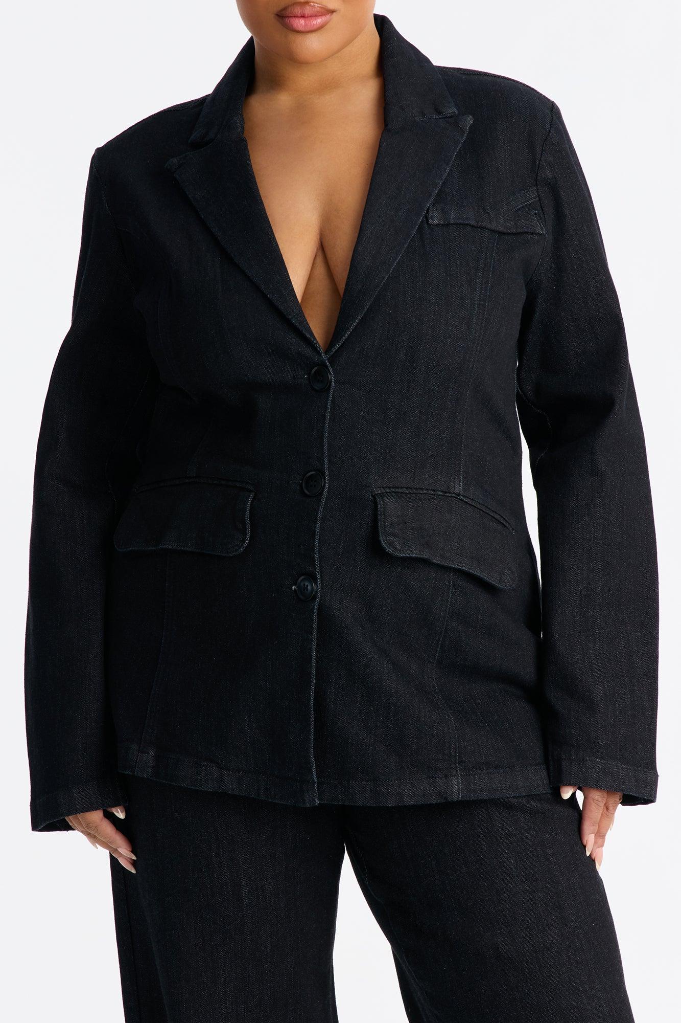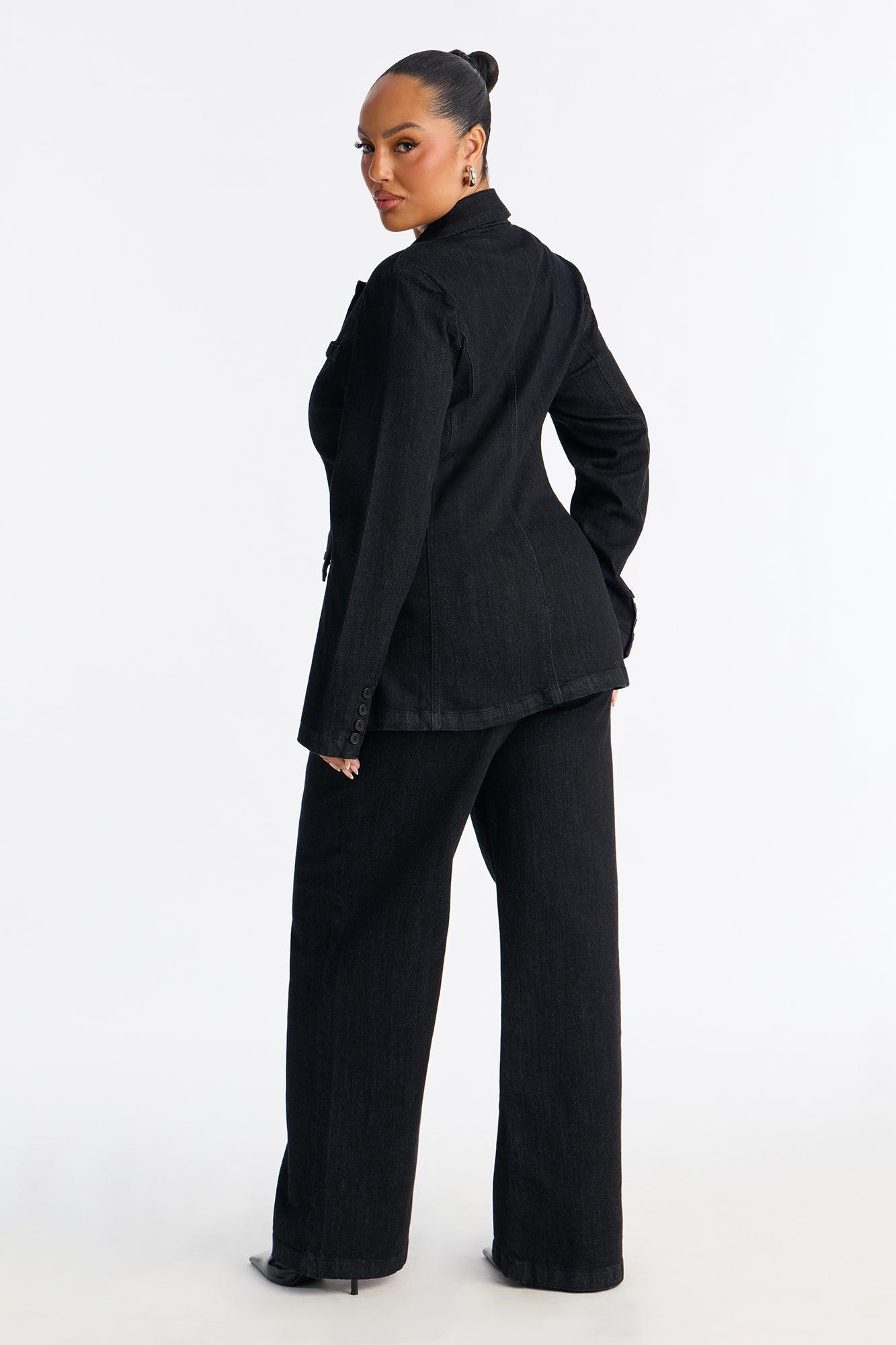 Available In Dark Denim. 2 Piece Ensemble Blazer And Pant Set Stretch Long Sleeve Button Up Wide Leg 33" Inseam Disclaimer: Due To The Specialized Wash & Distressing Process, Each Garment Is Unique 92% Cotton 5% Polyester 3% Spandex Imported California Proposition 65WARNING: Cancer and Reproductive Harm - www.P65Warnings.ca.gov.