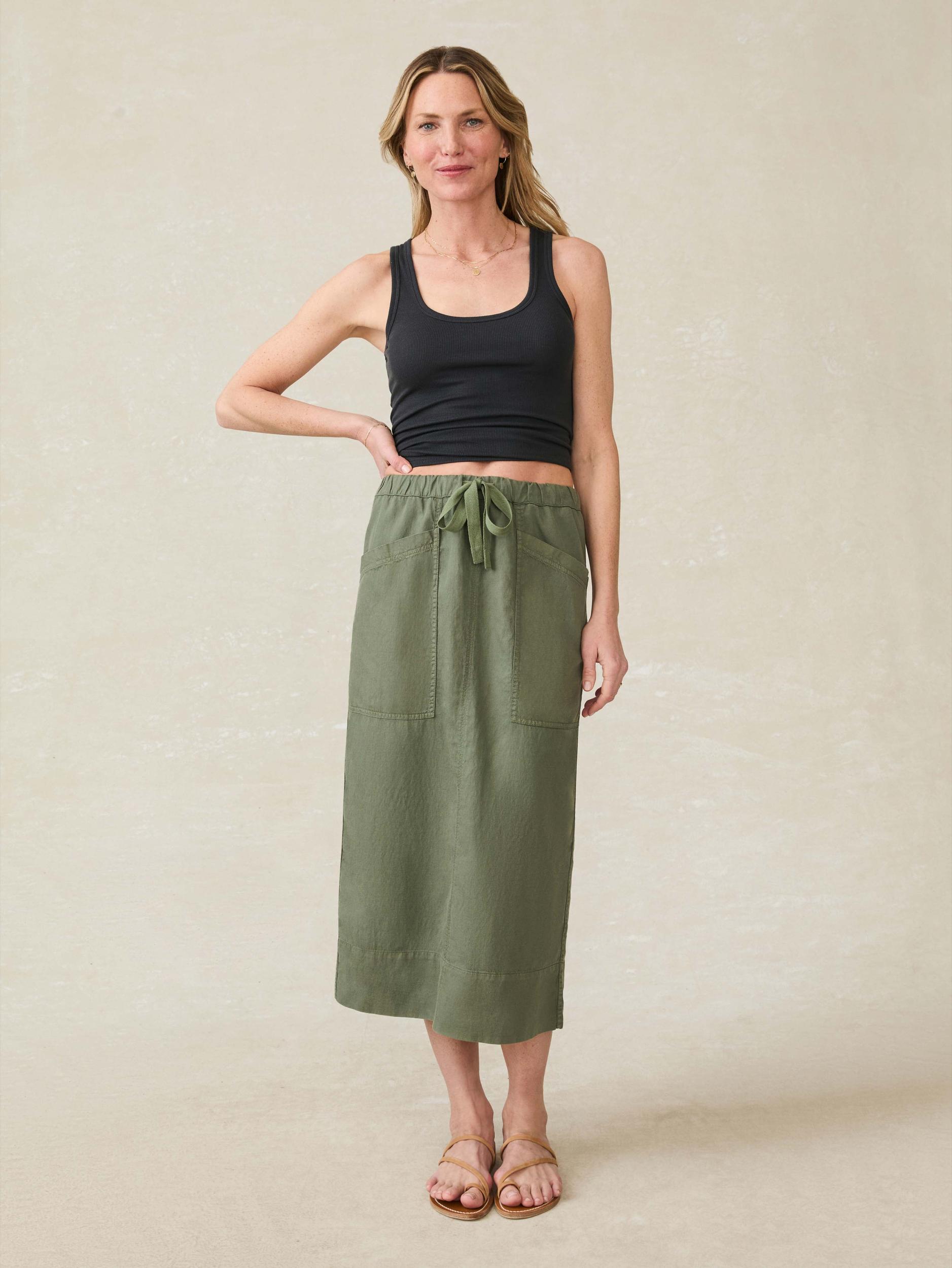 This utility skirt is your new work to weekend essential, effortlessly merging rugged style with a touch of heritage craftsmanship. Made from Faherty's special recipe of linen, organic cotton, and Tencel, it offers a unique blend of softness and durability that keeps getting better with every wear. With practical patch pockets for a laid-back vibe and a center-back slit that ensures ease of movement Fit: Classic Fit, Length: 32⅝" Detail: Encased elastic waistband with cotton tape at center front tie. Patch pockets at front. Slit at CB. Material: 55% TENCEL™ Lyocell, 22% Linen, 21% Organic Cotton, 2% Elastane Model: Edda is 5'10 wearing size Medium Care: Close all zippers before wash. Turn inside out. Machine wash cold with like colors. Delicate cycle. Do not bleach. Tumble dry low. Remove promptly. Warm iron if needed. WBS2501-THY