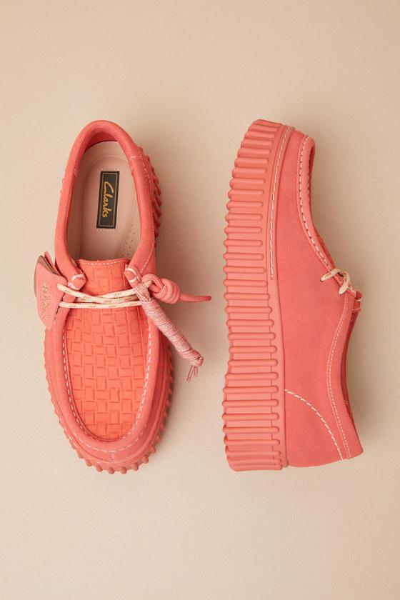 When looking to add the perfect pop of color, there's no better option than the Clarks Torhill Bee Coral Suede Leather Flatform Lace-Up Loafers! Genuine nubuck suede leather shapes a chunky, loafer-style silhouette with a rounded-toe upper that boasts a woven-like texture and a lace-up vamp. The low-cut collar sits atop a fun, textured flatform sole with a durable, crepe-effect and signature logo tag.