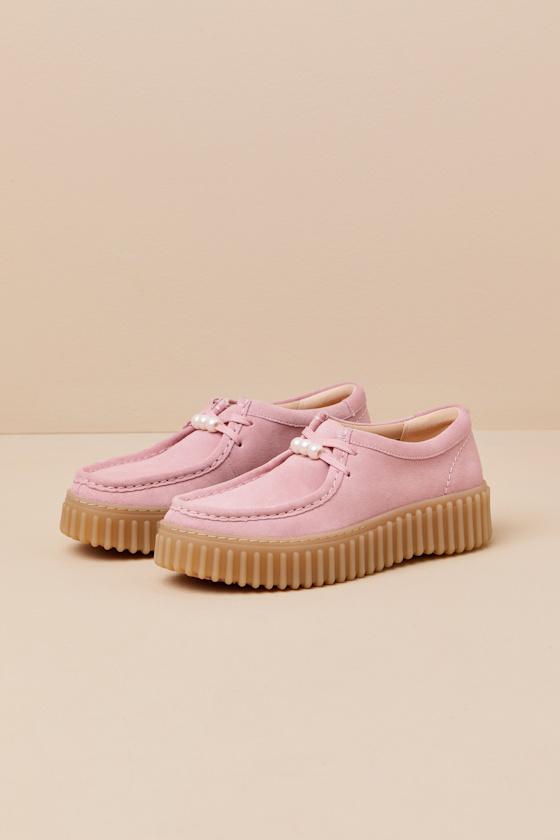 When looking to add the perfect pop of color, there's no better option than the Clarks Torhill Bee Dusty Rose Suede Leather Flatform Lace-Up Loafers! Soft, genuine suede leather shapes a chunky, loafer-style silhouette with a rounded-toe upper that boasts a distressed speckled effect and a lace-up vamp with pearly white beads. The low-cut collar features signature debossed logo tags and sits atop a fun, textured flatform sole with a durable, crepe-effect.