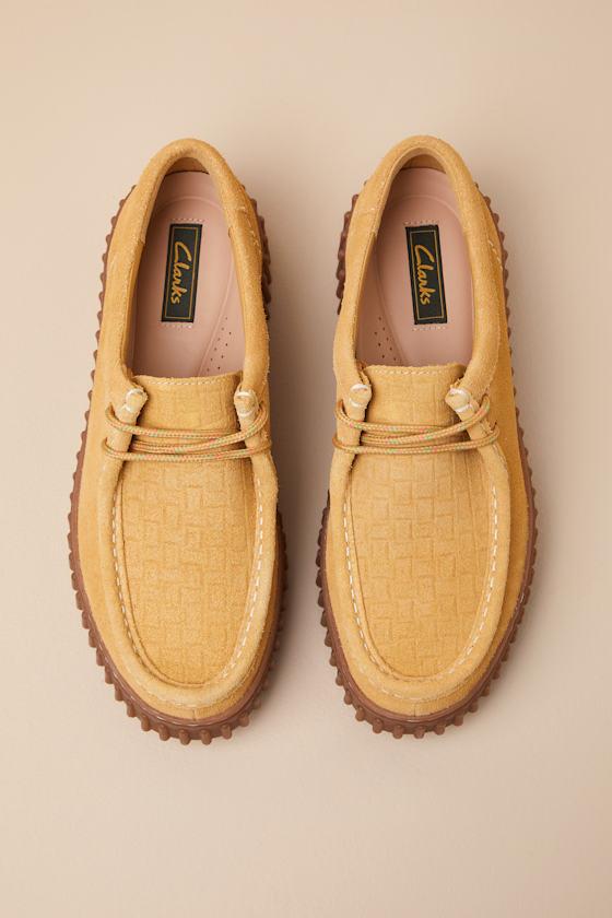 When looking to add the perfect pop of color, there's no better option than the Clarks Torhill Bee Golden Tan Suede Leather Flatform Lace-Up Loafers! Genuine nubuck suede leather shapes a chunky, loafer-style silhouette with a rounded-toe upper that boasts a woven-like texture and a lace-up vamp. The low-cut collar sits atop a fun, textured flatform sole with a durable, crepe-effect and signature logo tag.