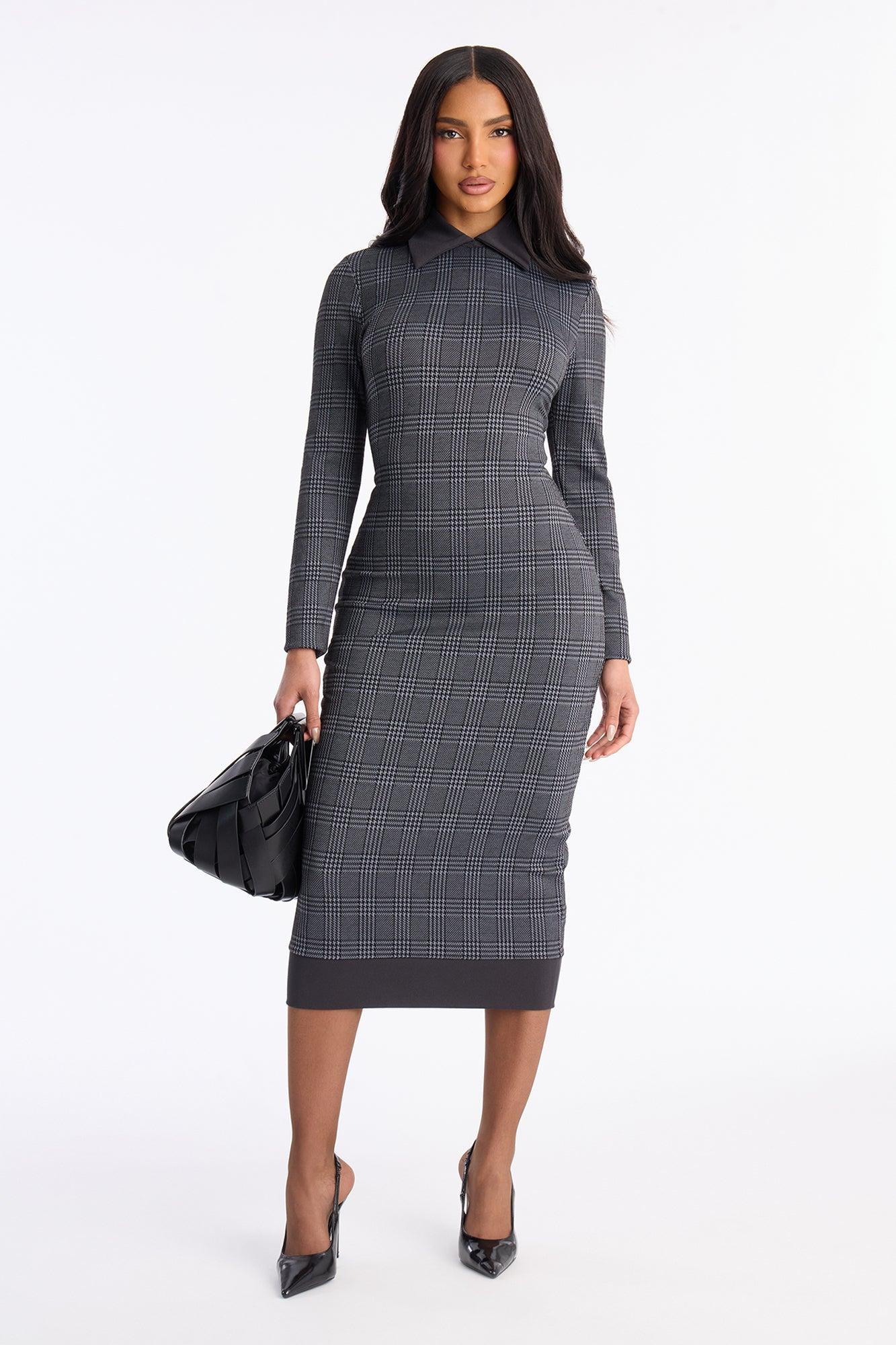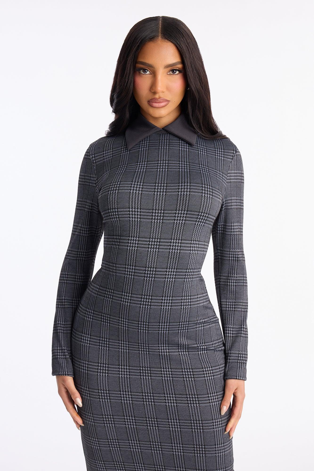 Available In Burgundy And Grey. Houndstooth Midi Dress Collar Long Sleeve Hidden Back Zipper Stretch Length Measured Flat = 45" Disclaimer: Pattern Placement May Vary. Self: 83% Polyester 15% Rayon 2% Spandex Contrast: 95% Polyester 5% Spandex Imported California Proposition 65WARNING: Cancer and Reproductive Harm - www.P65Warnings.ca.gov.