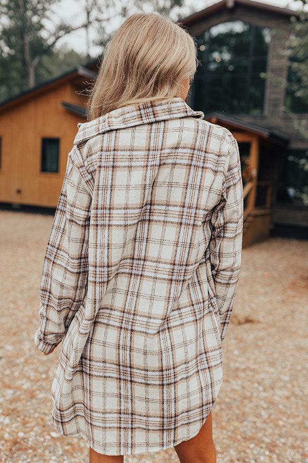 - Plaid season has officially arrived with this cozy dress! - Soft unlined material with a cream, brown, and serenity hued plaid print - A collared neckline - A button-up front - Long, loose sleeves with button closure cuffs - Hidden side pockets - A relaxed silhouette that ends in a mini dress length hemline