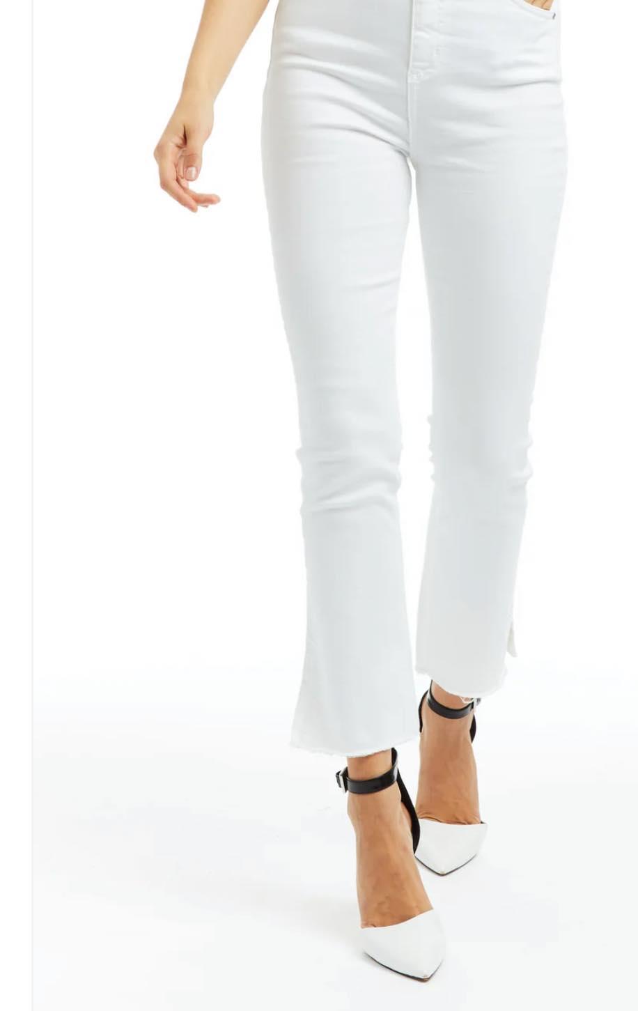 These jeans by Tractr are classic, Spring perfect choice. Designed with a flattering high-rise waist and a slim fit through the hips and thighs, they create a sleek silhouette while providing comfortable wear. The cropped length is accented by a raw hem and small side slits at the ankles, giving them a modern, edgy detail. Perfect for pairing with a crisp white blouse and ballet flats for a chic and effortless look, these jeans are a versatile wardrobe staple for those who love to add a pop of white to their fashion choices.