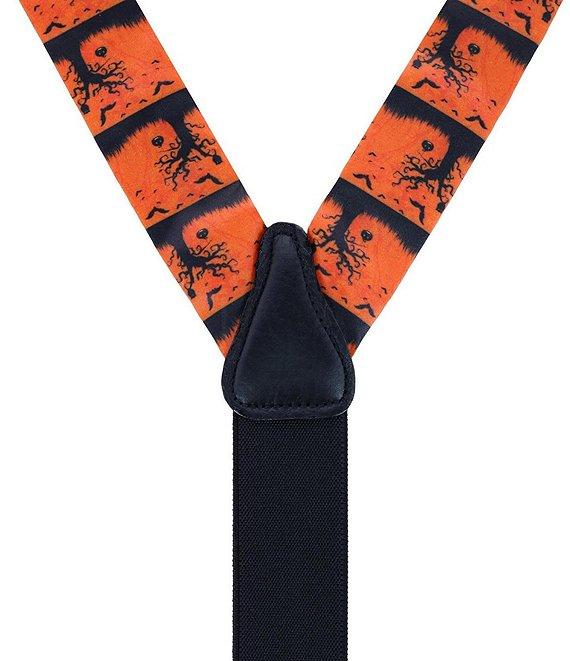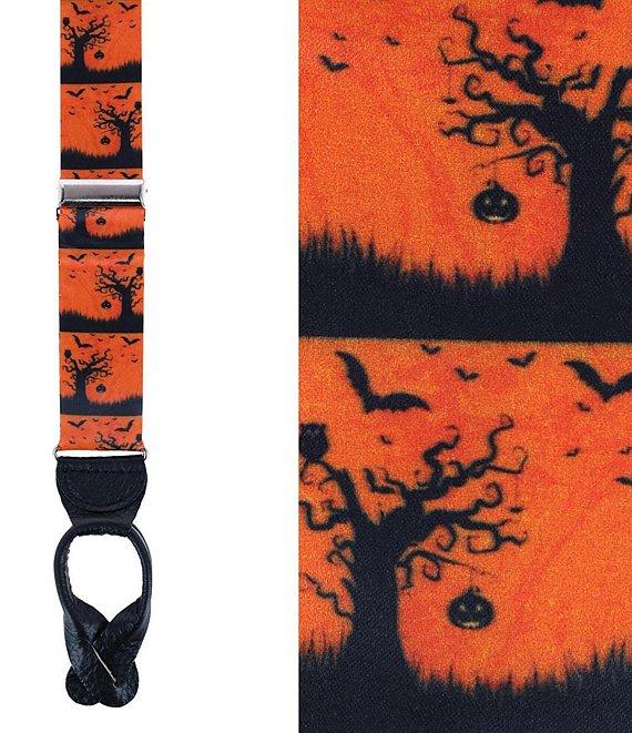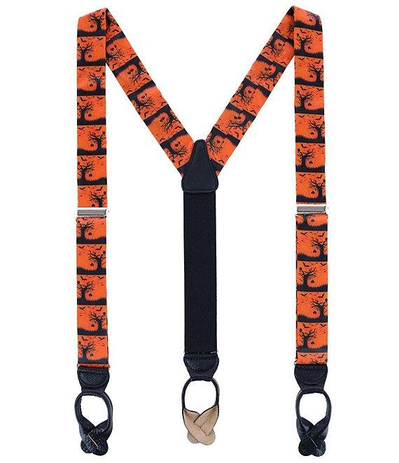 From Trafalgar, these suspenders feature: Features a fun and spooky Halloween scene motif Terrific way to show off your Halloween spirit and look great doing it Measures 1 3/8" inch or 35mm wide Adjustable up to 48 inches Full grain leather back patch and button ends, with silver adjusters Y-Back style with elastic back strap for all-day comfort Silk Spot clean Imported.
