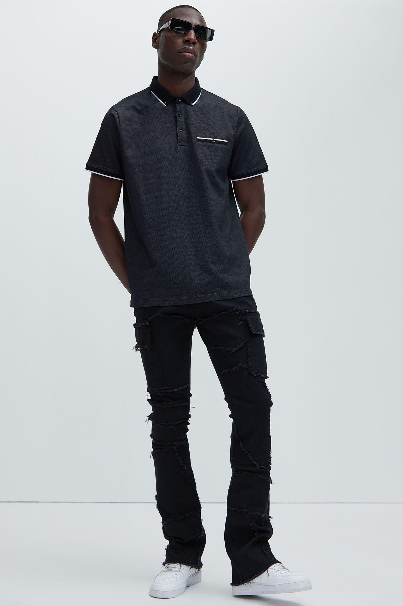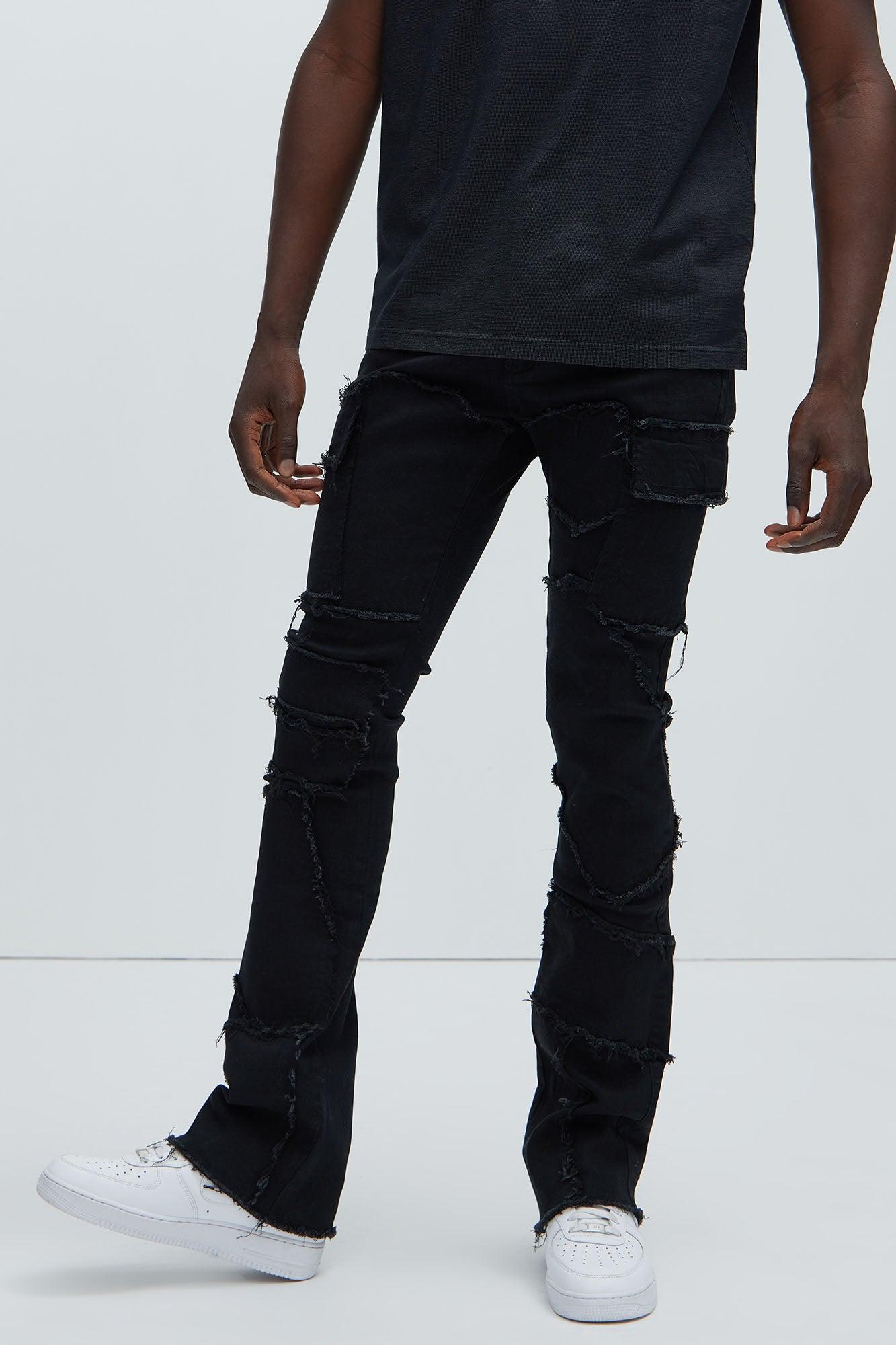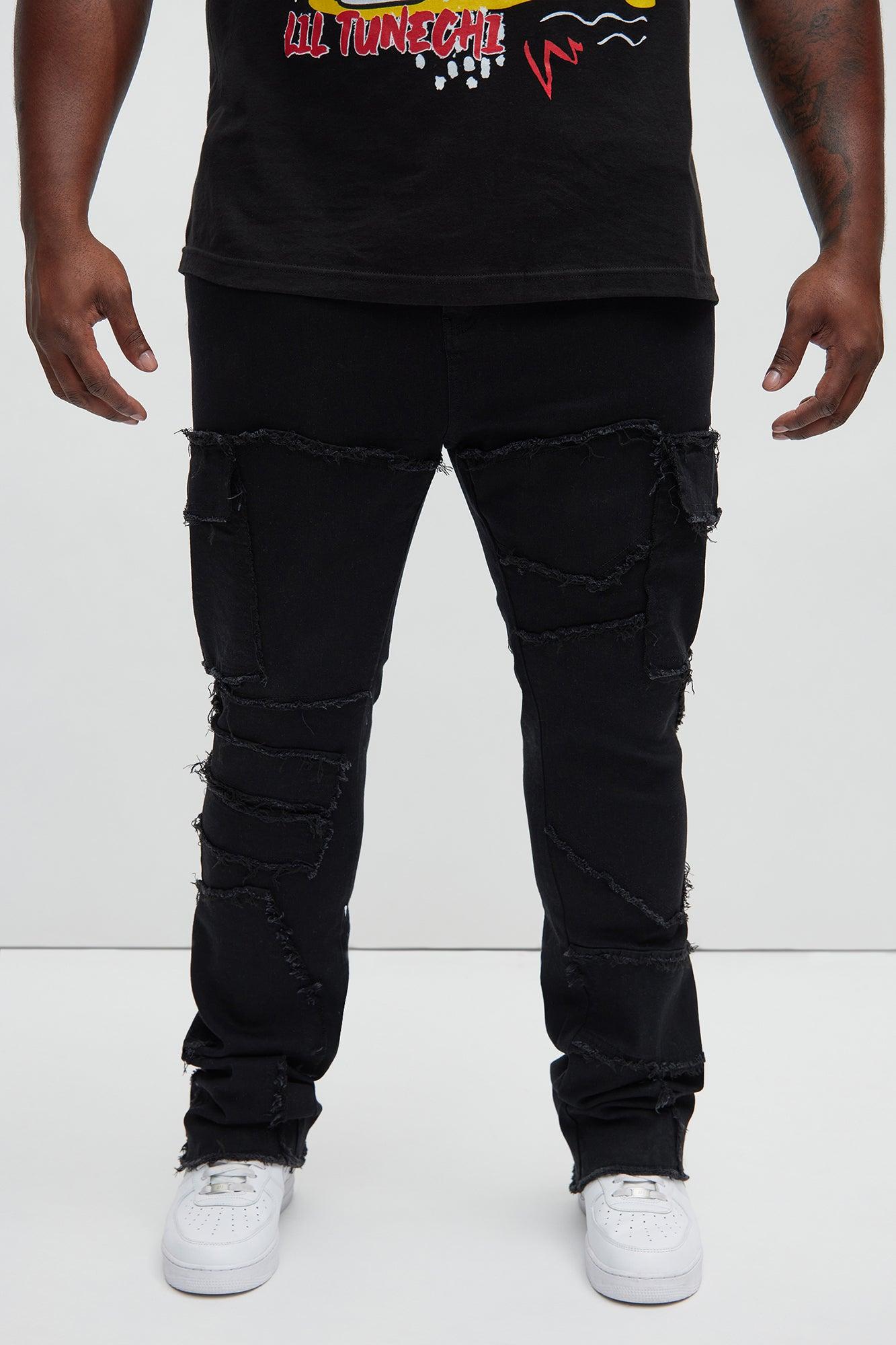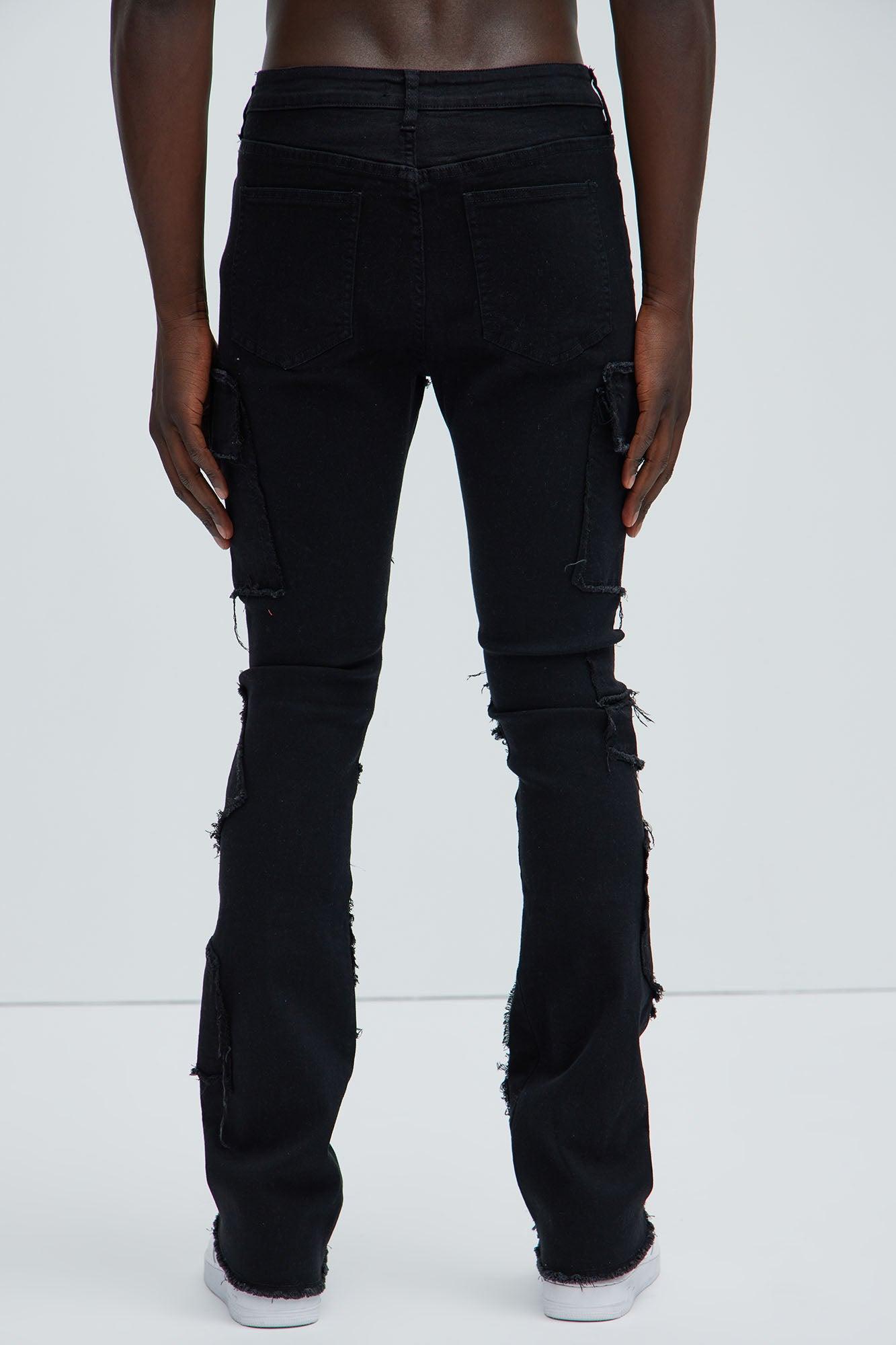 Available In Black. Flared Fit Zip Fly 70% Cotton 28% Polyester 2% Spandex Disclaimer: Due To The Specialized Distressing & Wash Process, Each Garment Is Unique. Disclaimer: Pattern Placement May Vary. Button Closure 5 Pocket Detail Cargo Pockets Frayed Detail Open Hem Imported