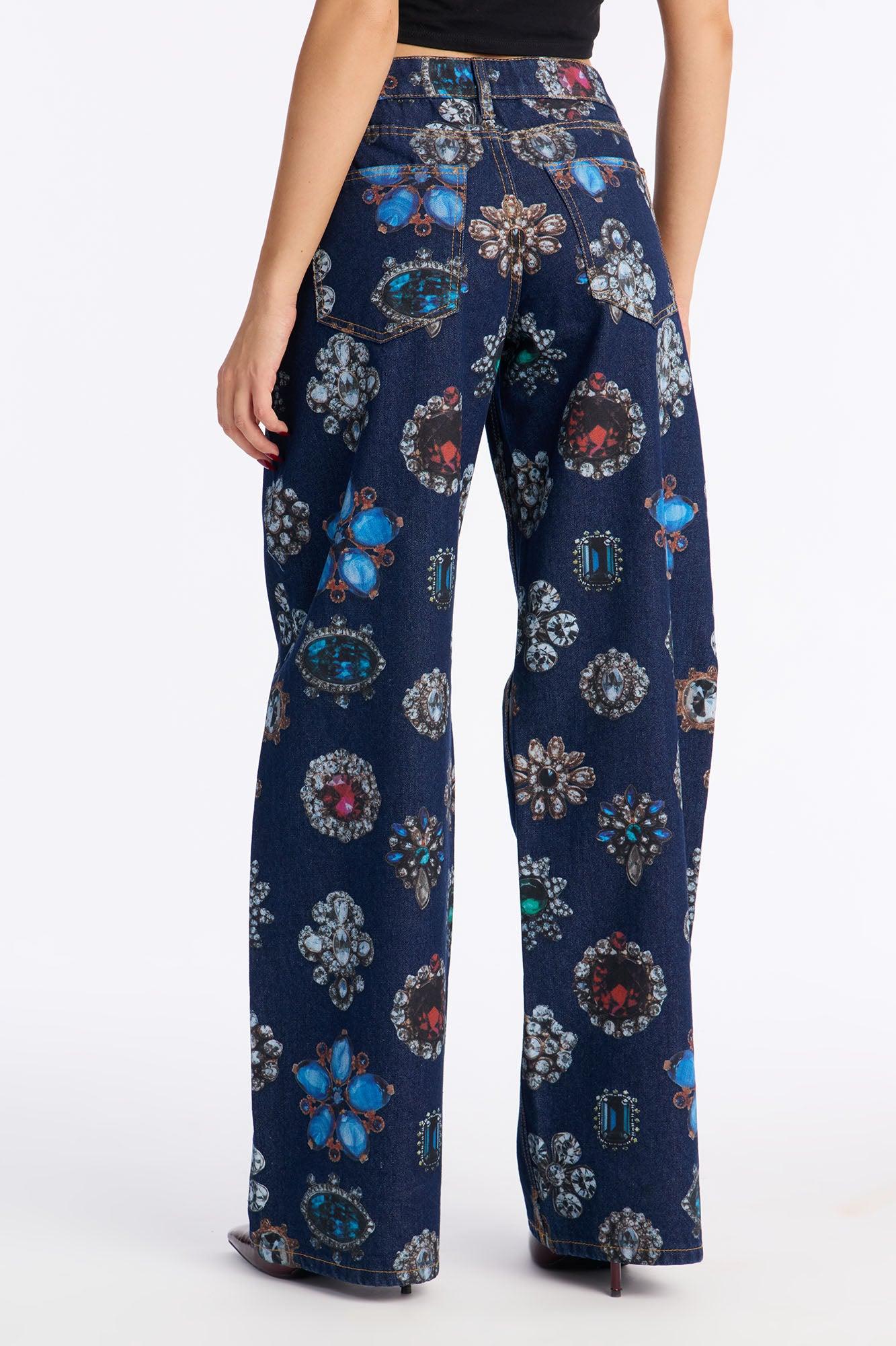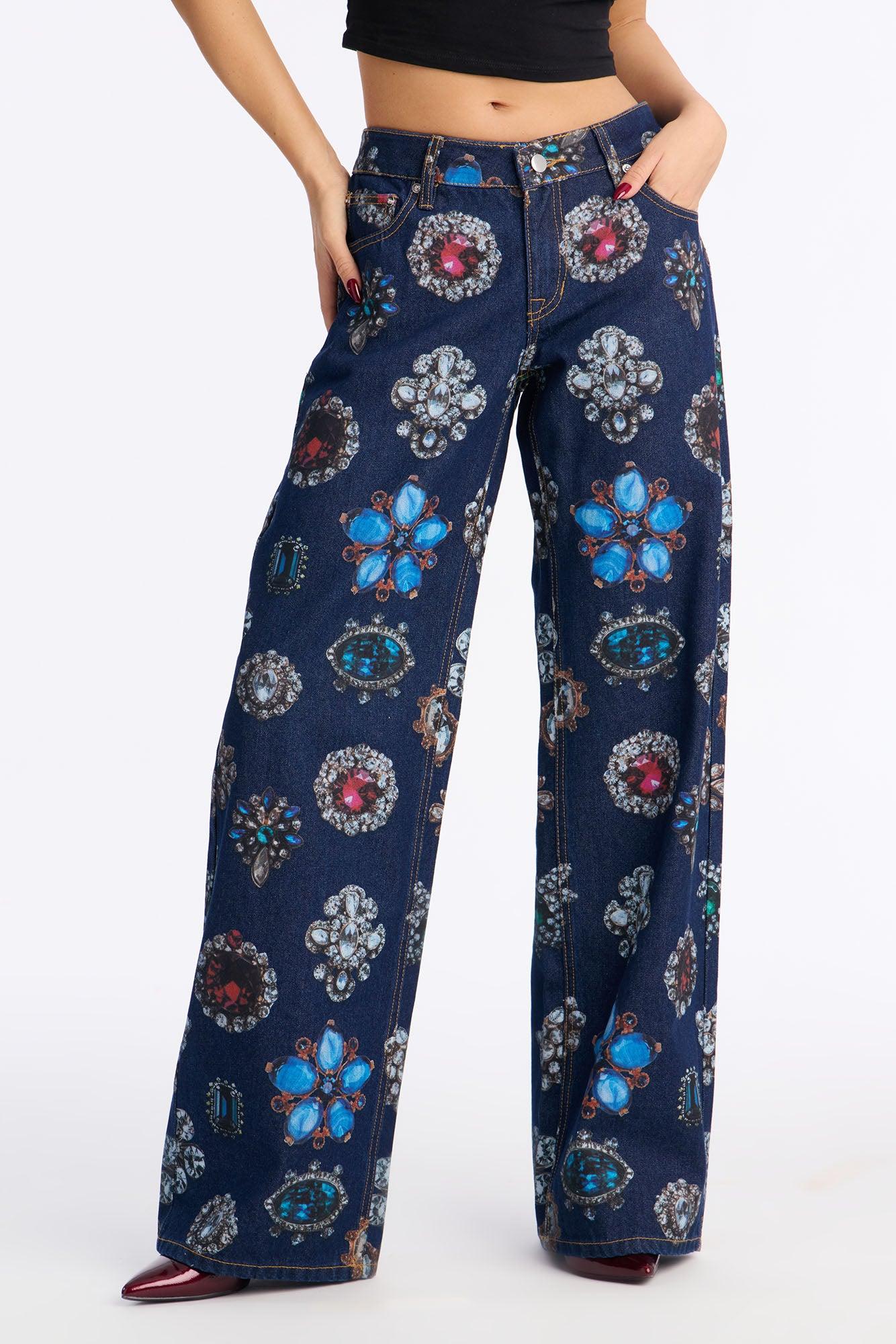 Available In Dark Wash. Wide Leg Jean 5 Pocket Novelty Print 9" Rise 33" Inseam Non-Stretch Disclaimer: Print Placement Will Vary. Self: 57% Cotton 29% Polyester 14% Viscose Imported California Proposition 65WARNING: Cancer and Reproductive Harm - www.P65Warnings.ca.gov.