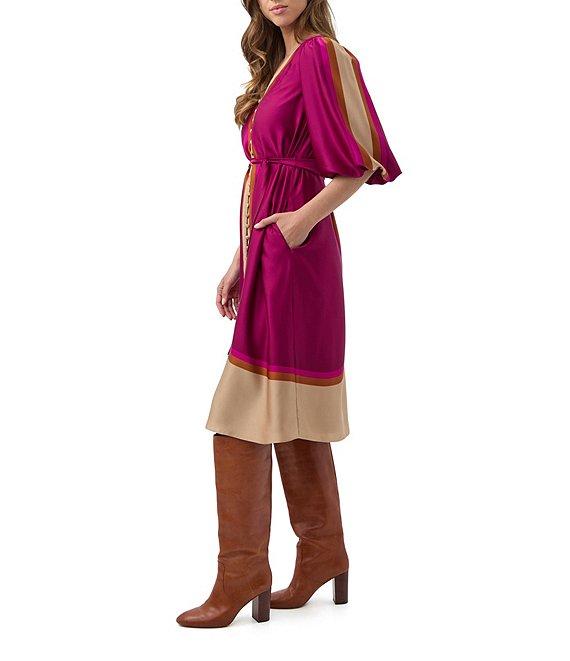 Trina Turk Linden Printed Satin Georgette V-Neck Elbow Sleeve Tie Waist Dress