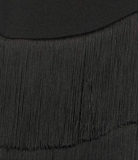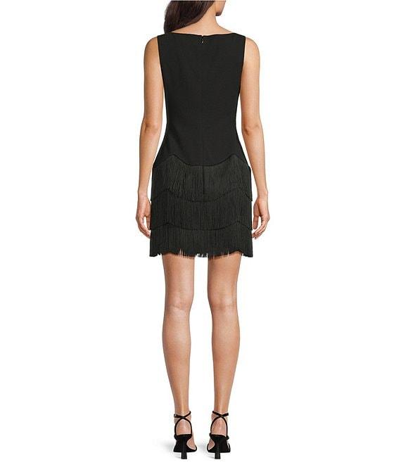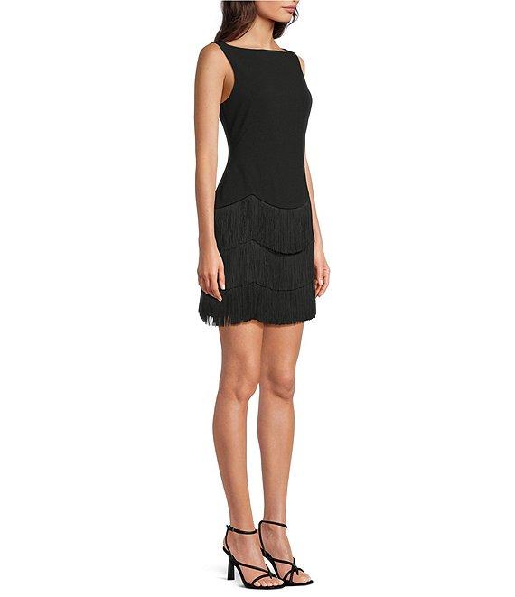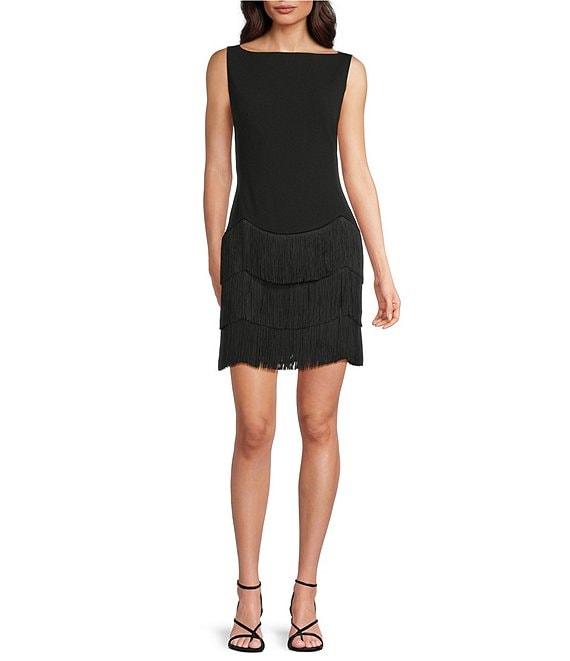 Trina Turk Palais Crepe Knit Boat Neck Sleeveless Fringe Sheath Dress