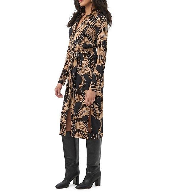 From Trina Turk, this dress features: Printed jersey knit fabrication Shirt dress silhouette Point collar neckline Long sleeves with button cuffs Tie waist detail Straight hem with side slits Button front closure Approx. 45" length Rayon/spandex Hand wash Made in the USA.