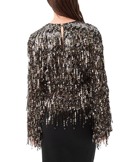 Trina Turk Satine Fringe Sequin Round Neck Long Bell Sleeve Top