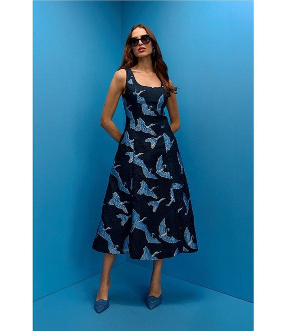 Trina Turk Valor Printed Jacquard Square Neck Sleeveless A-Line Midi Dress