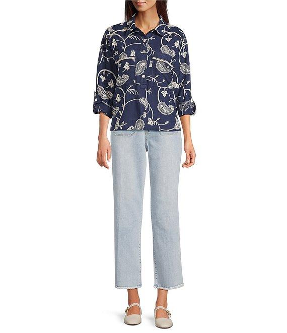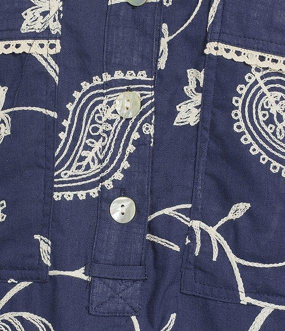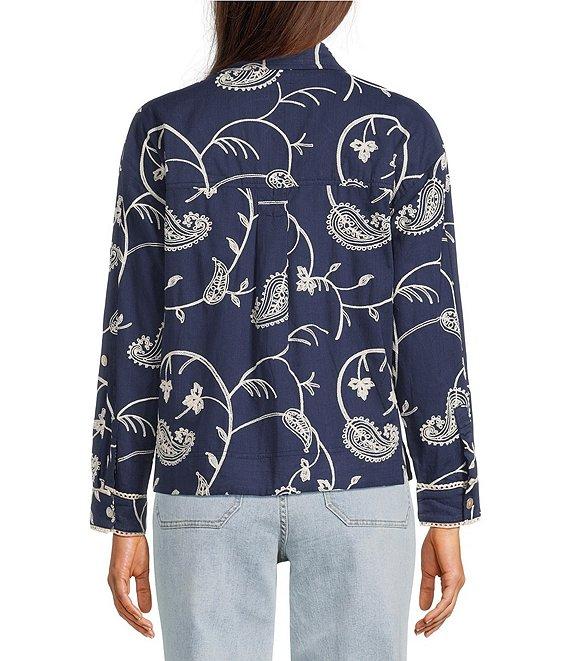 From Tru Luxe Jeans, this shirt features: Woven fabrication Point collar Long roll-tab sleeves All over embroidery Paisley printed Lace trim on pockets, cuffs and shoulders Two chest pockets Straight hem with side vents Pop-over with buttons Approx. 25" length Cotton Machine wash cold/ tumble dry low Imported.
