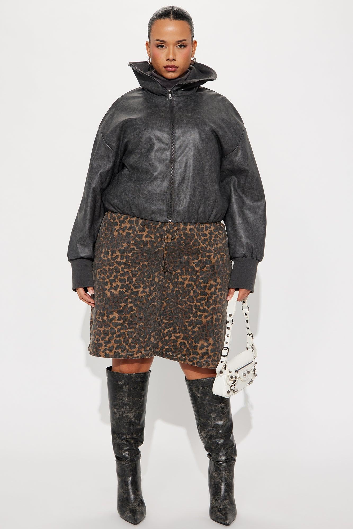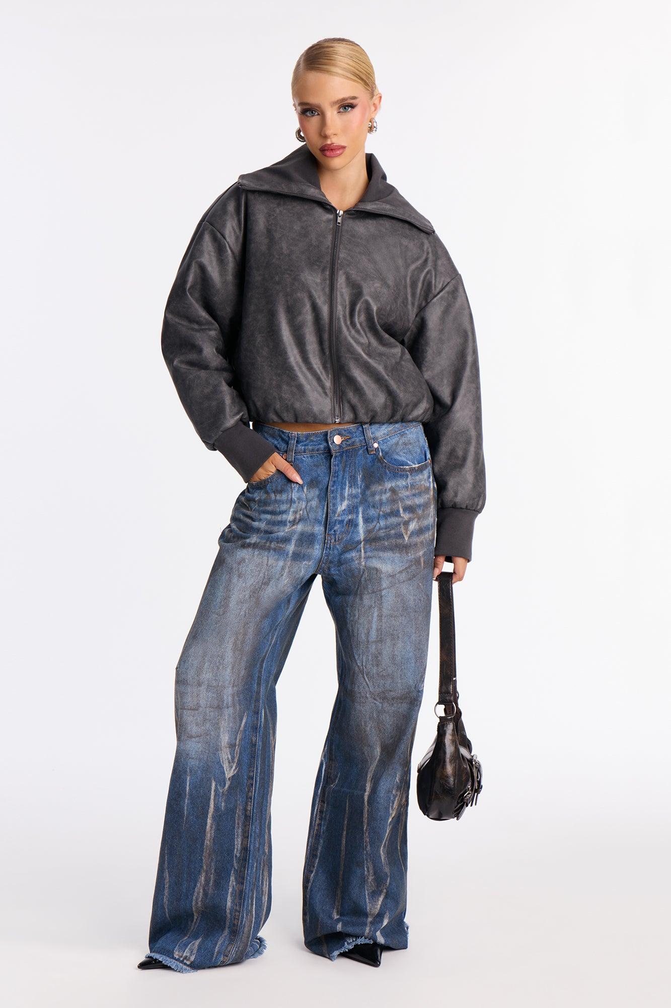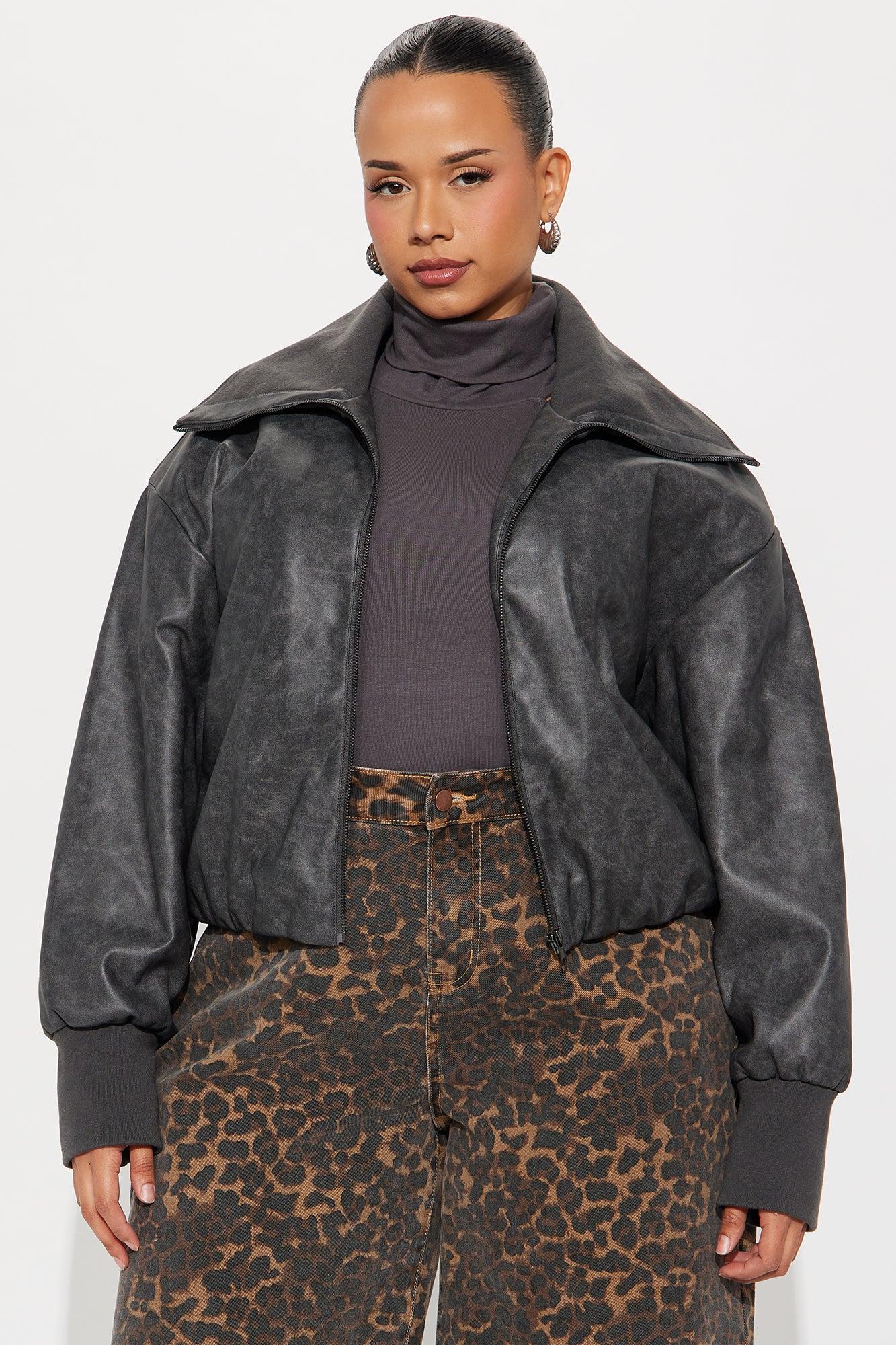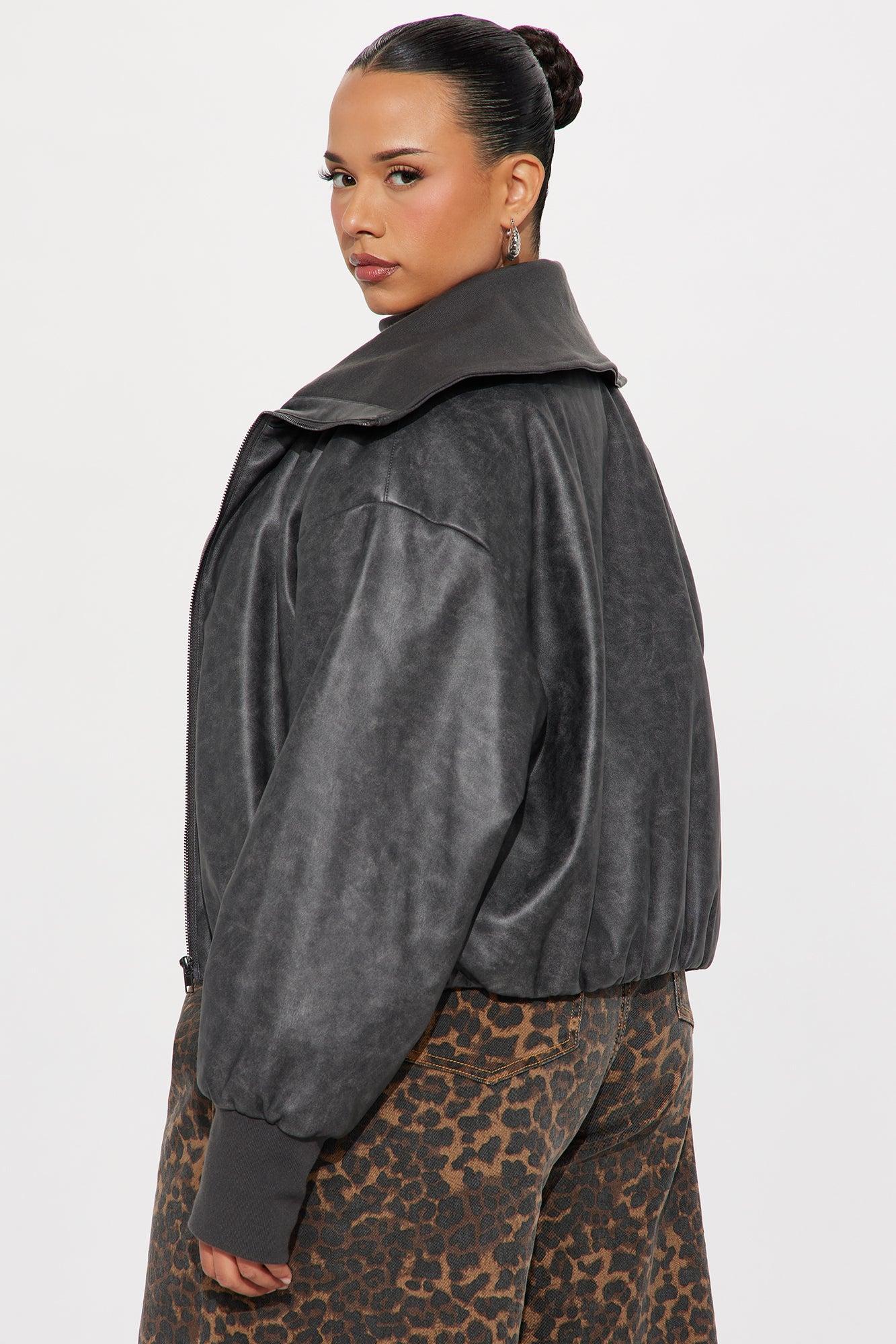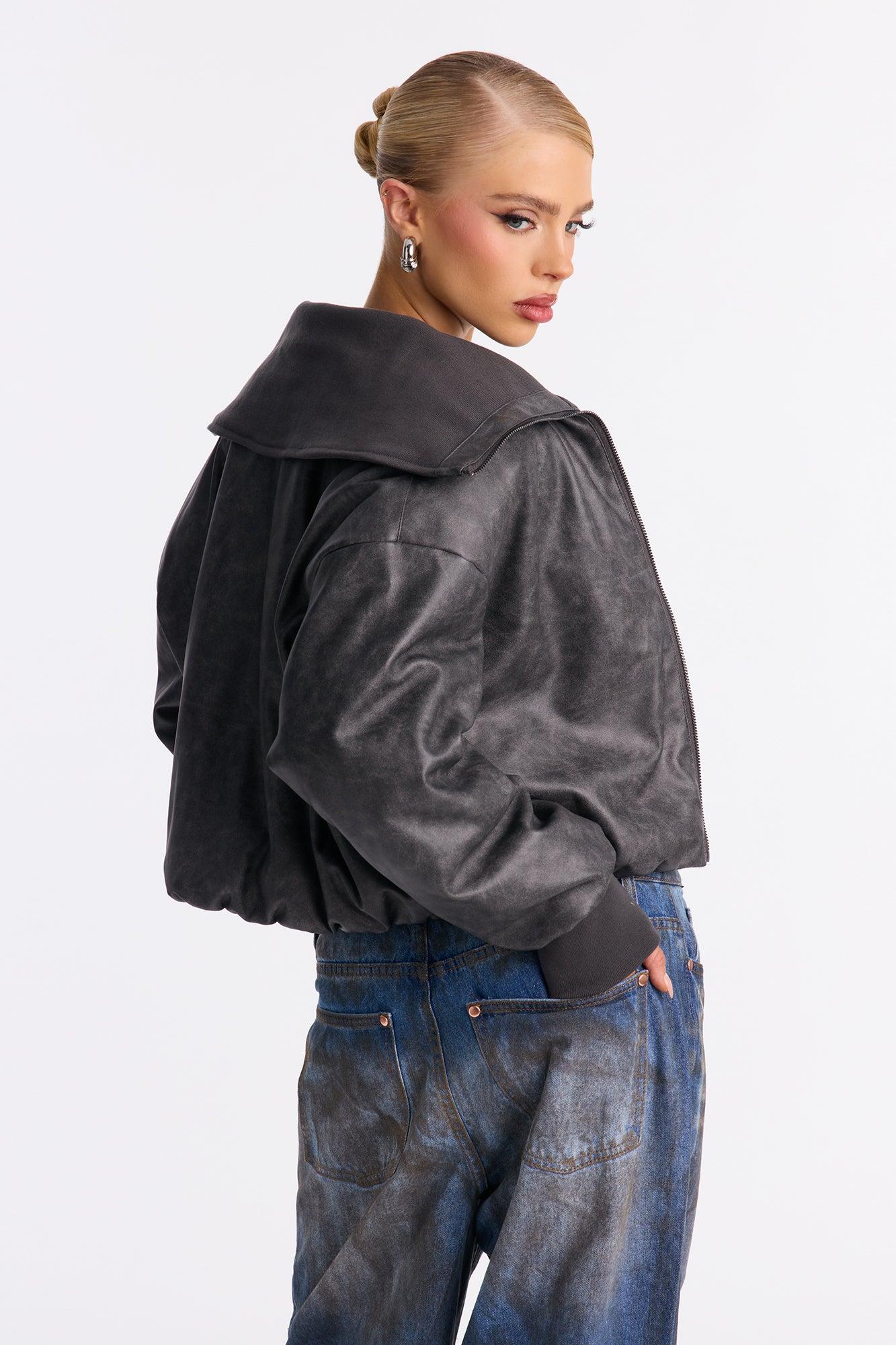 Available In Charcoal And Navy. Faux Leather Bomber Jacket Fold Over Collar Long Sleeves Zipper Closure Washed Ribbed Cuffs And Collar Fully Lined Self: 100% Polyester with Polyurethane Coating Contrast: 98% Polyester 2% Spandex Lining: 100% Polyester Filling: 100% Polyester Imported California Proposition 65WARNING: Cancer and Reproductive Harm - www.P65Warnings.ca.gov.