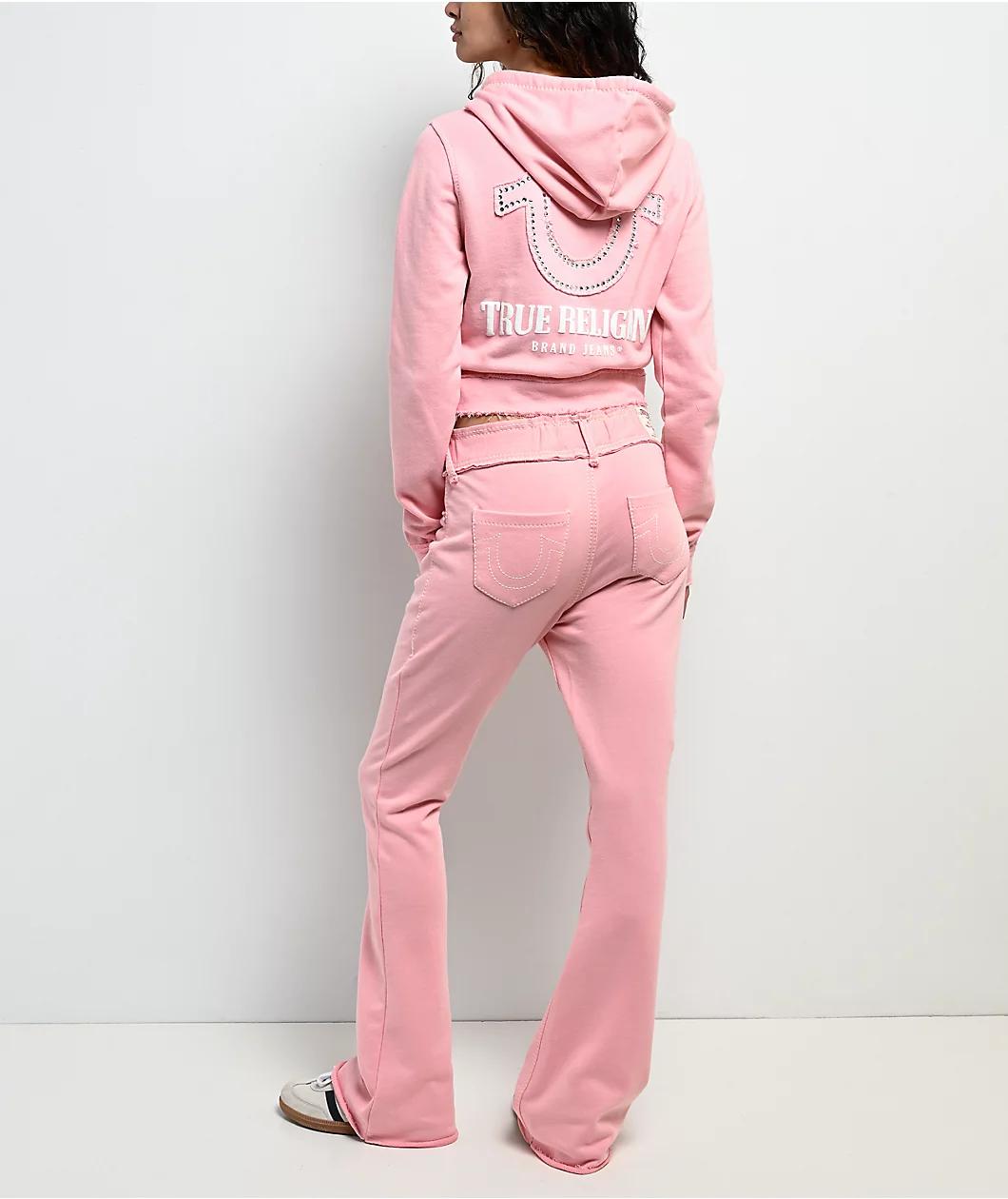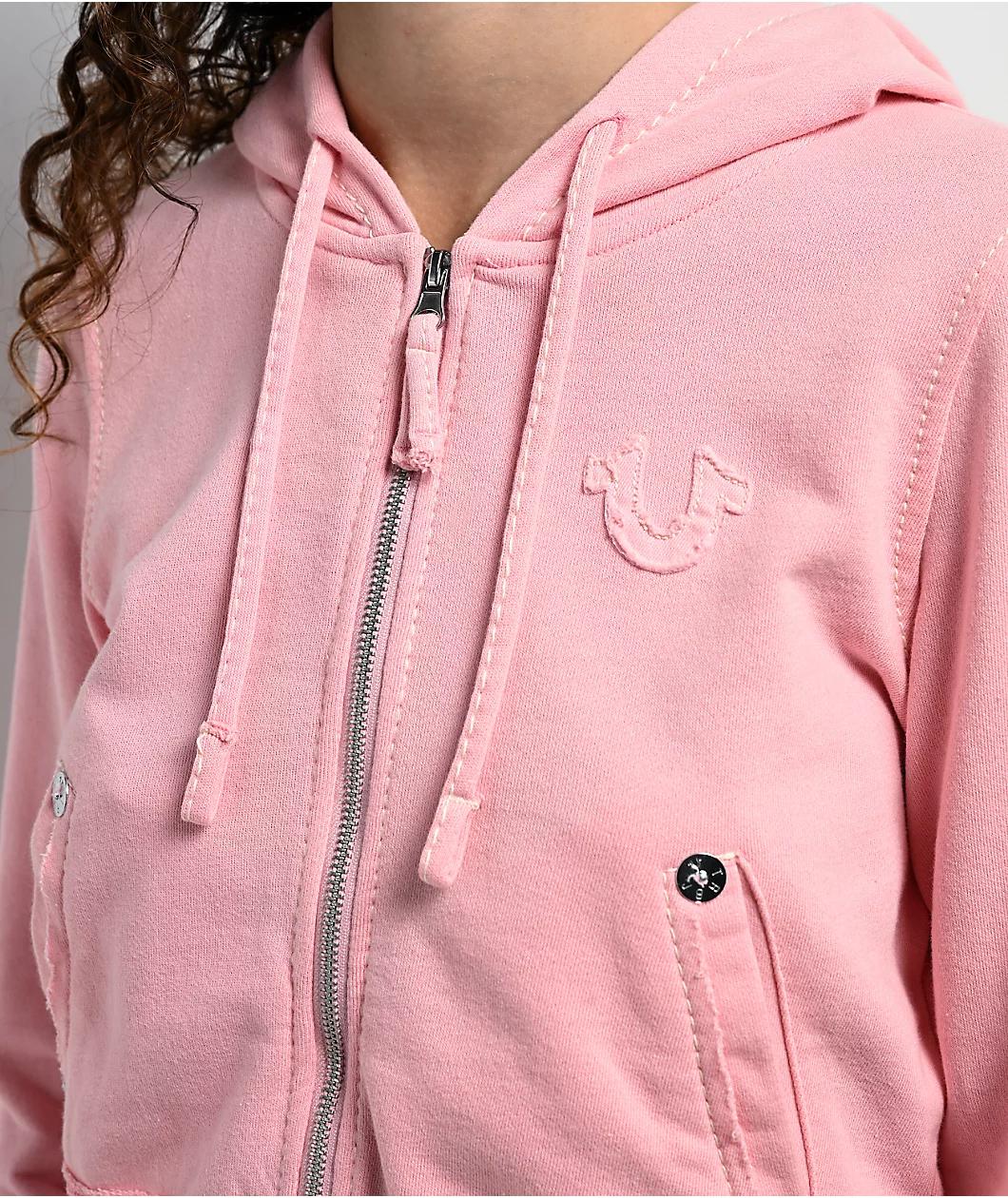 Add a distressed Y2K look to your outfit with the Raw Edge Big T Shrunken zip hoodie from True Religion in a Candy pink colorway and a flattering crop silhouette. Embracing a streetwear design, the cotton blend sweatshirt shows reverse embroidered br