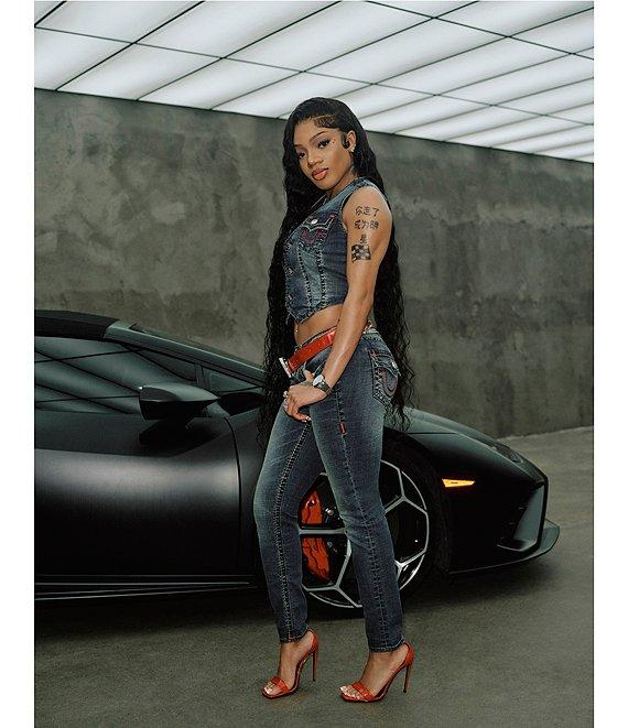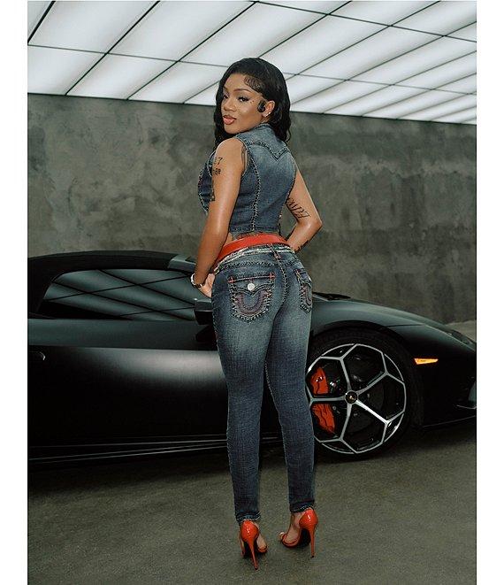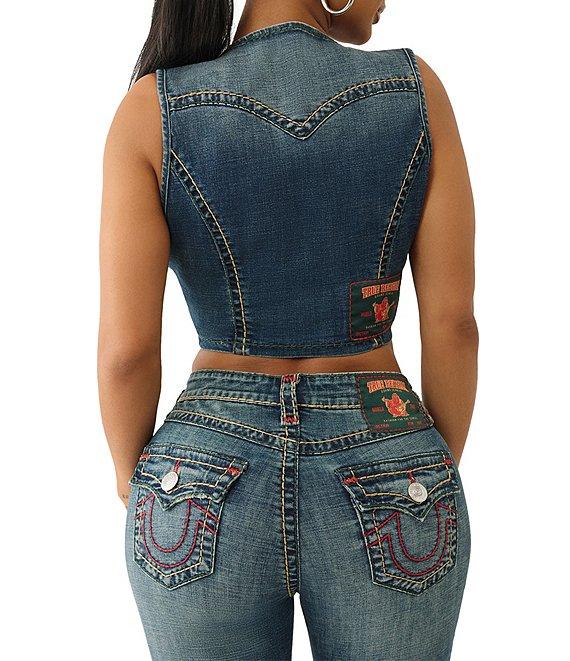 From True Religion, this vest features: Denim fabrication Cropped silhouette Plunging v-neckline Sleeveless Tonal super stitching Front flap pockets Button front closure Approx. 19" length Cotton/polyester/elastane Handwash Imported.