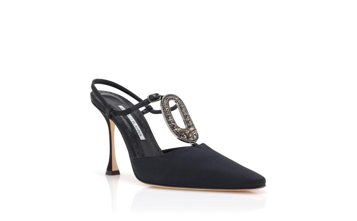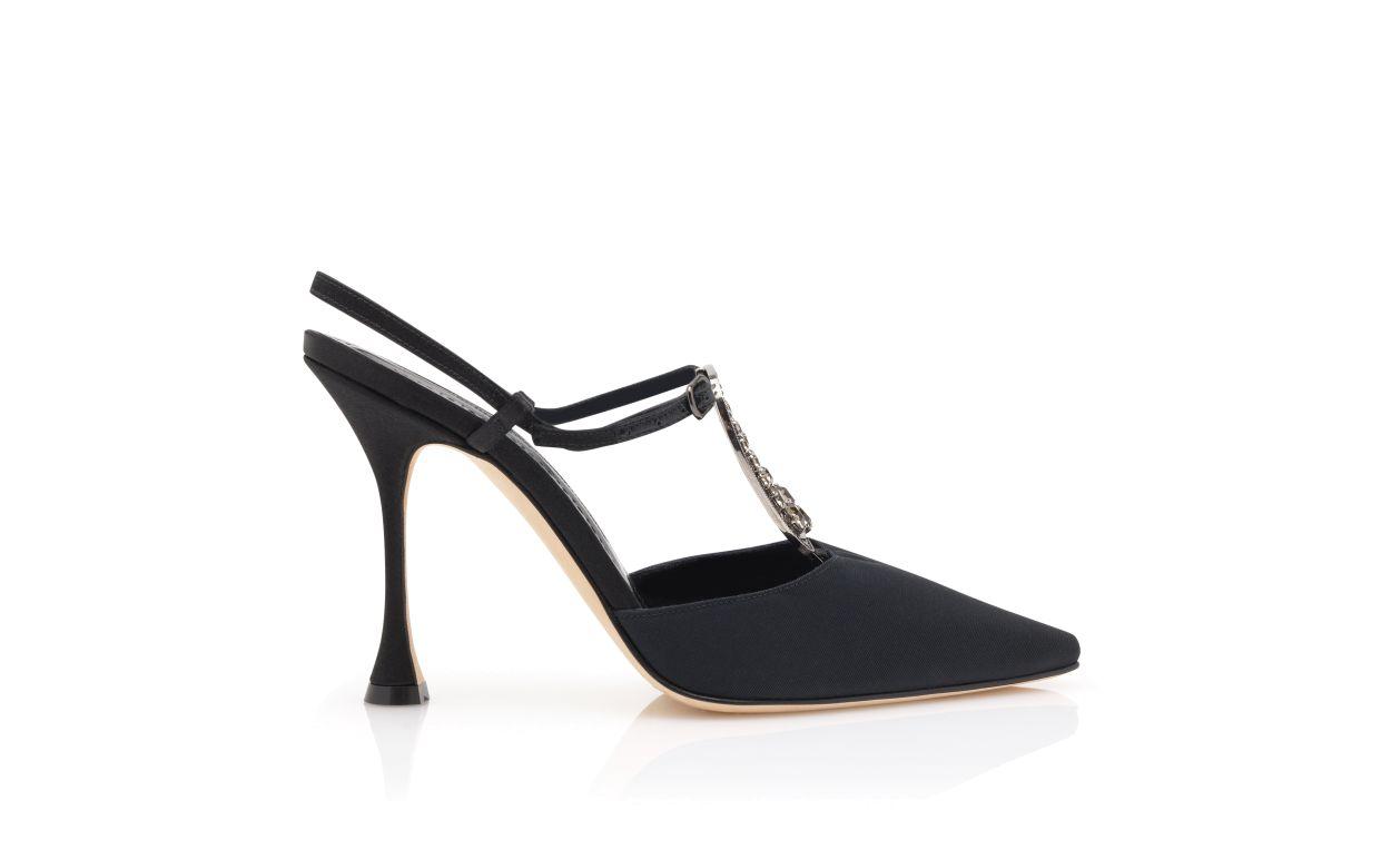 Black grosgrain almond toe pumps featuring T-Bar design with oval buckle, adorned with coloured stones encased in a gunmetal frame and ankle strap closure. Finished with a flared high heel.