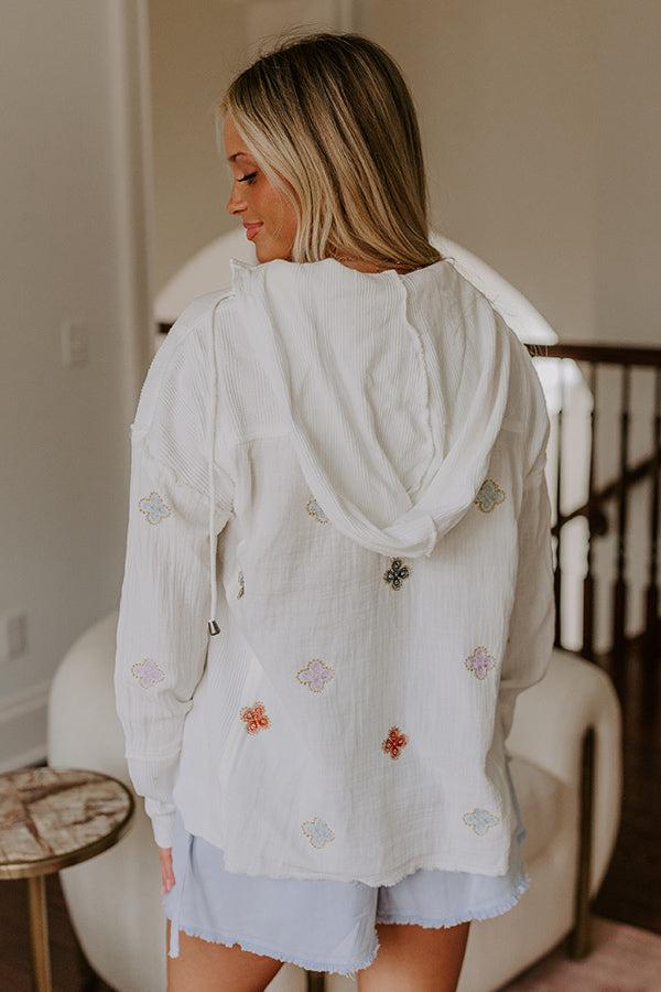 - This jacket is the cutest way to upgrade your outfit! The playful embroidery adds the perfect stylish twist. - Unlined materials featuring subtly textured material as well as waffle knit material - Abstract floral embroidery featuring gold, lavender, black, and a blue hue - A collared neckline with a hooded back featuring a functional drawstring - A buttoned front - Long sleeves - Unfinished seam accents - A functional chest pocket - A relaxed silhouette that ends in an unfinished hemline with side slit accents