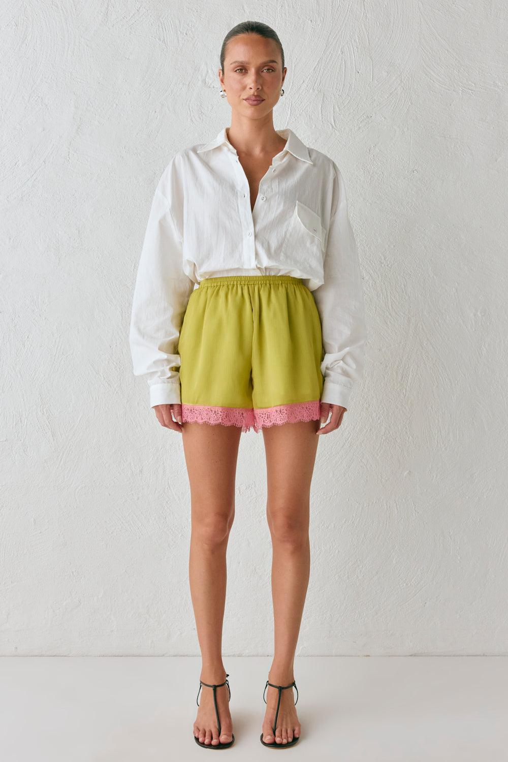 The Tulia Shorts in Aloe feature an elastic waist and contrast lace hem detail. Designed in Australia.