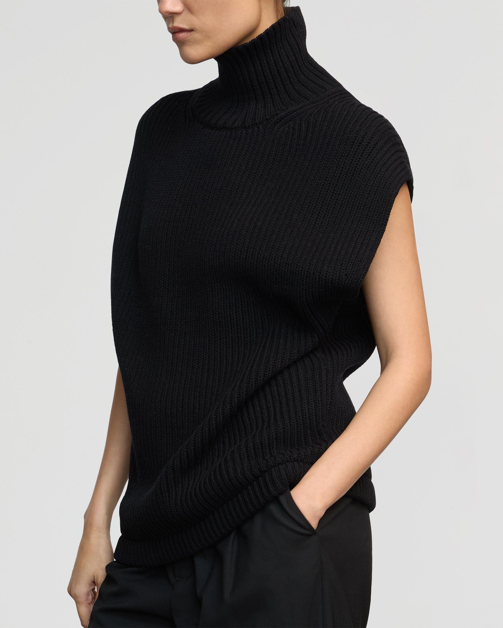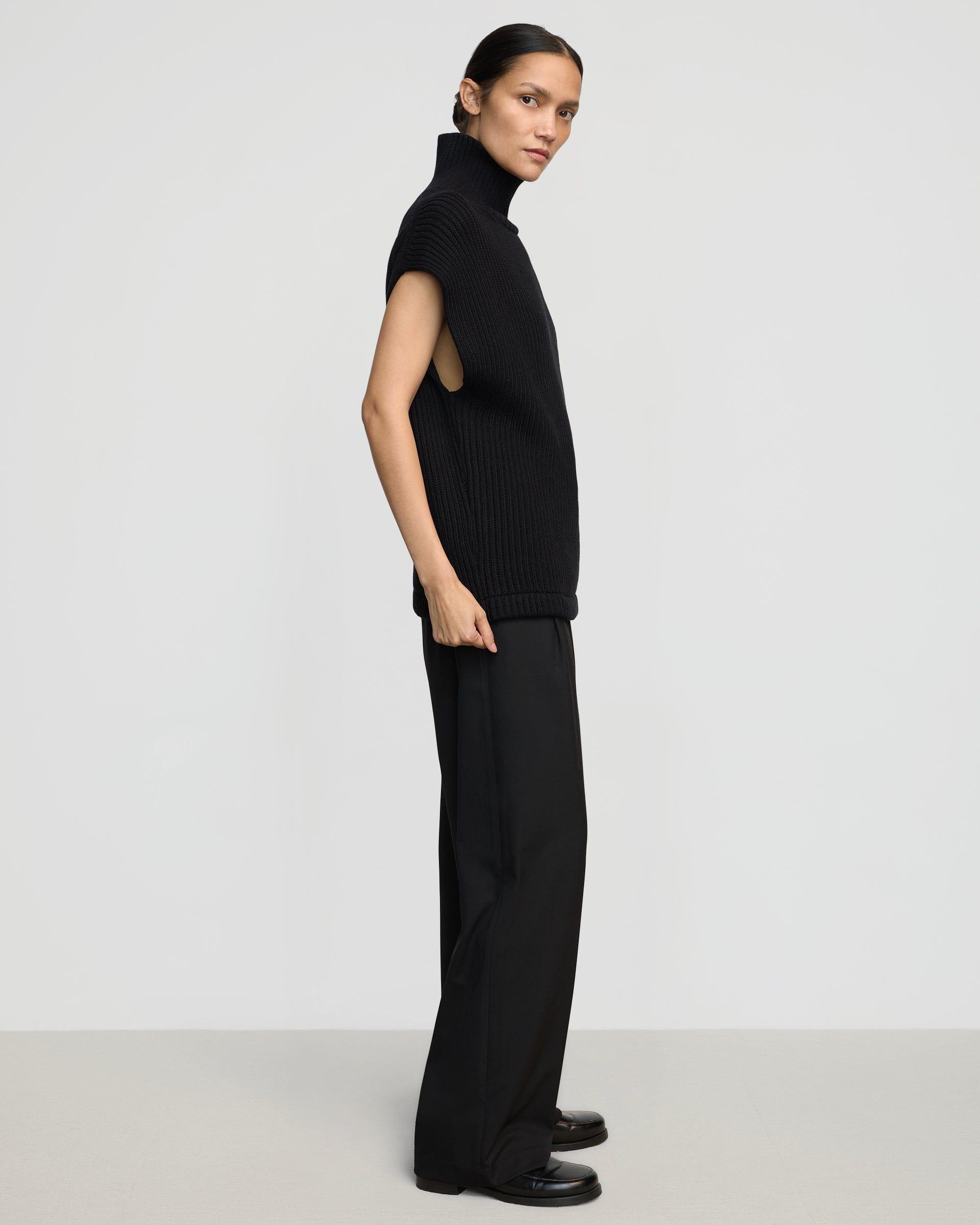 An architectural thick ribbed turtle-neck vest. We'd style her with anything from casual denim for a polished yet relaxed look, or a pop of color for a chic statement. See below for our general Size Guide and available measurements Made of 60% organic cotton 30% nylon 10% wool Hand wash cold and lay flat to dry