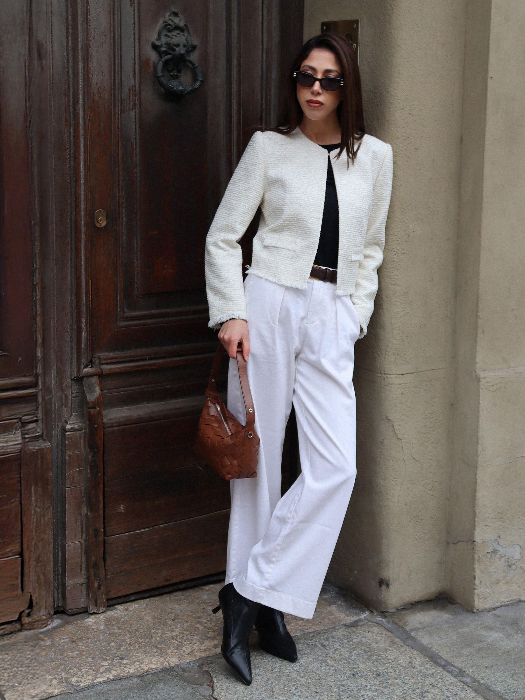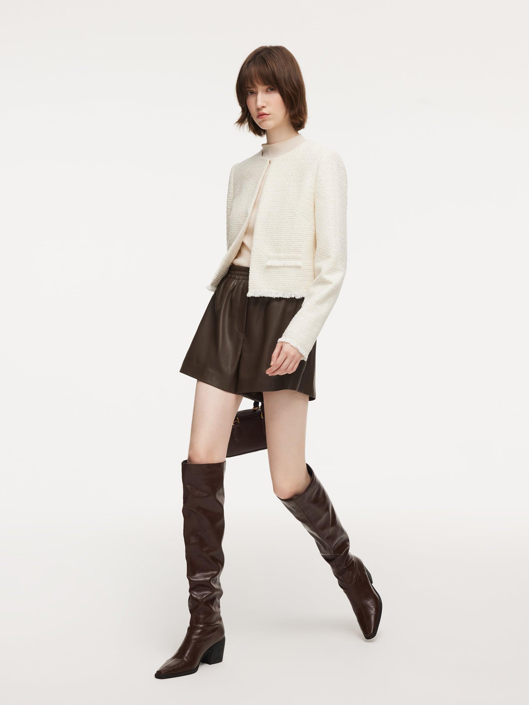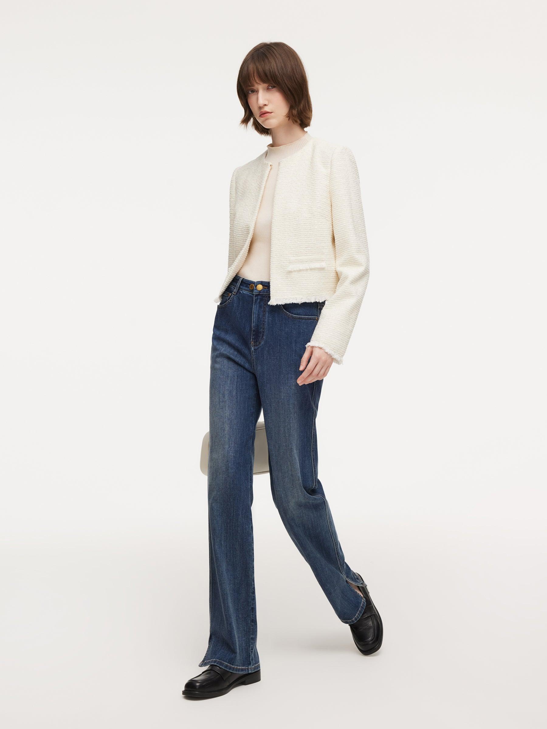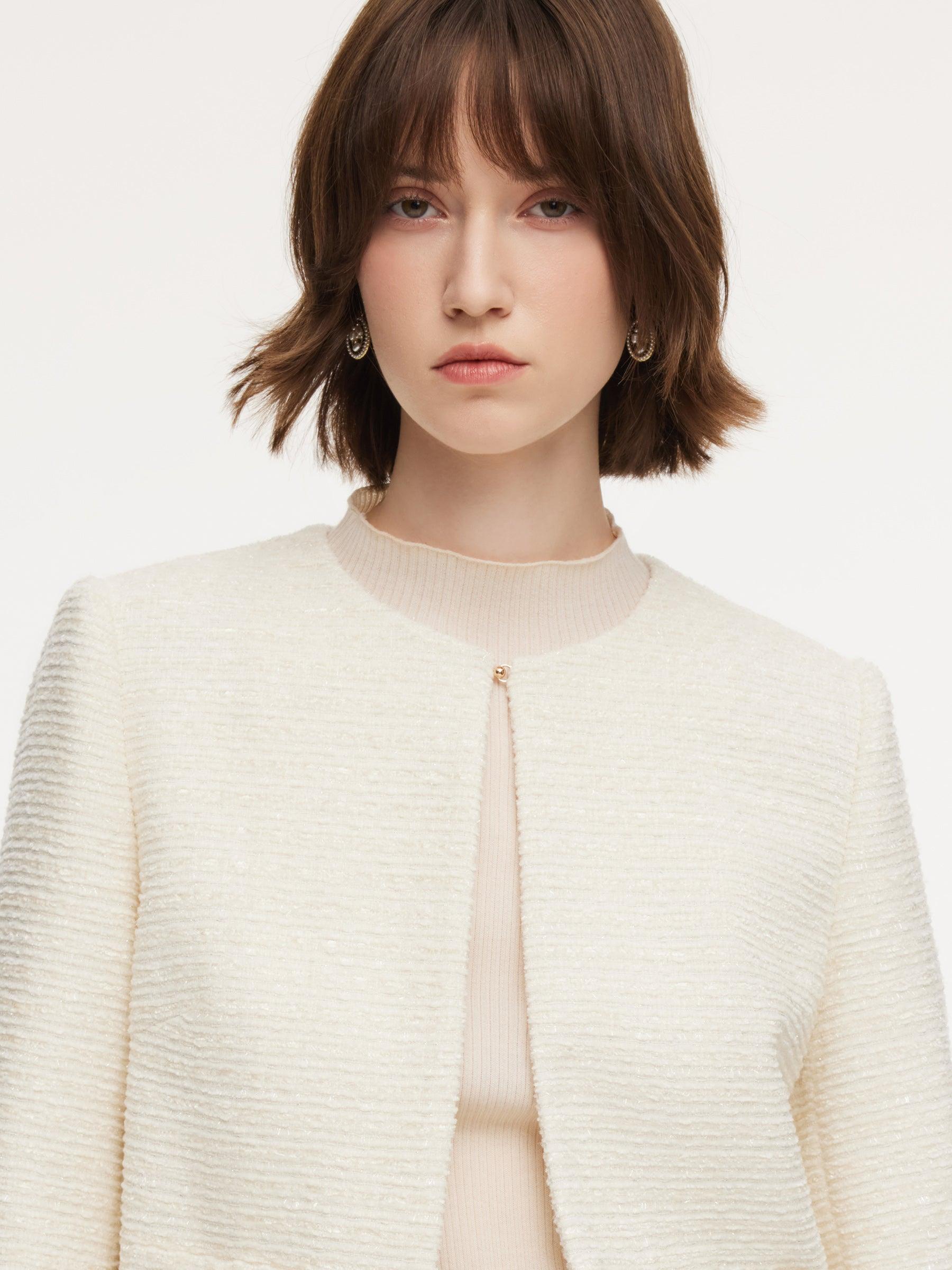 -Soft and comfortable -Round neck -H-line fit This chic short jacket is crafted from a soft, comfortable fabric and designed with a clean H-line silhouette for a refined, modern feel. Featuring a classic round neckline with a single front button closure, it is finished with frayed hem details at the cuffs and hem for a