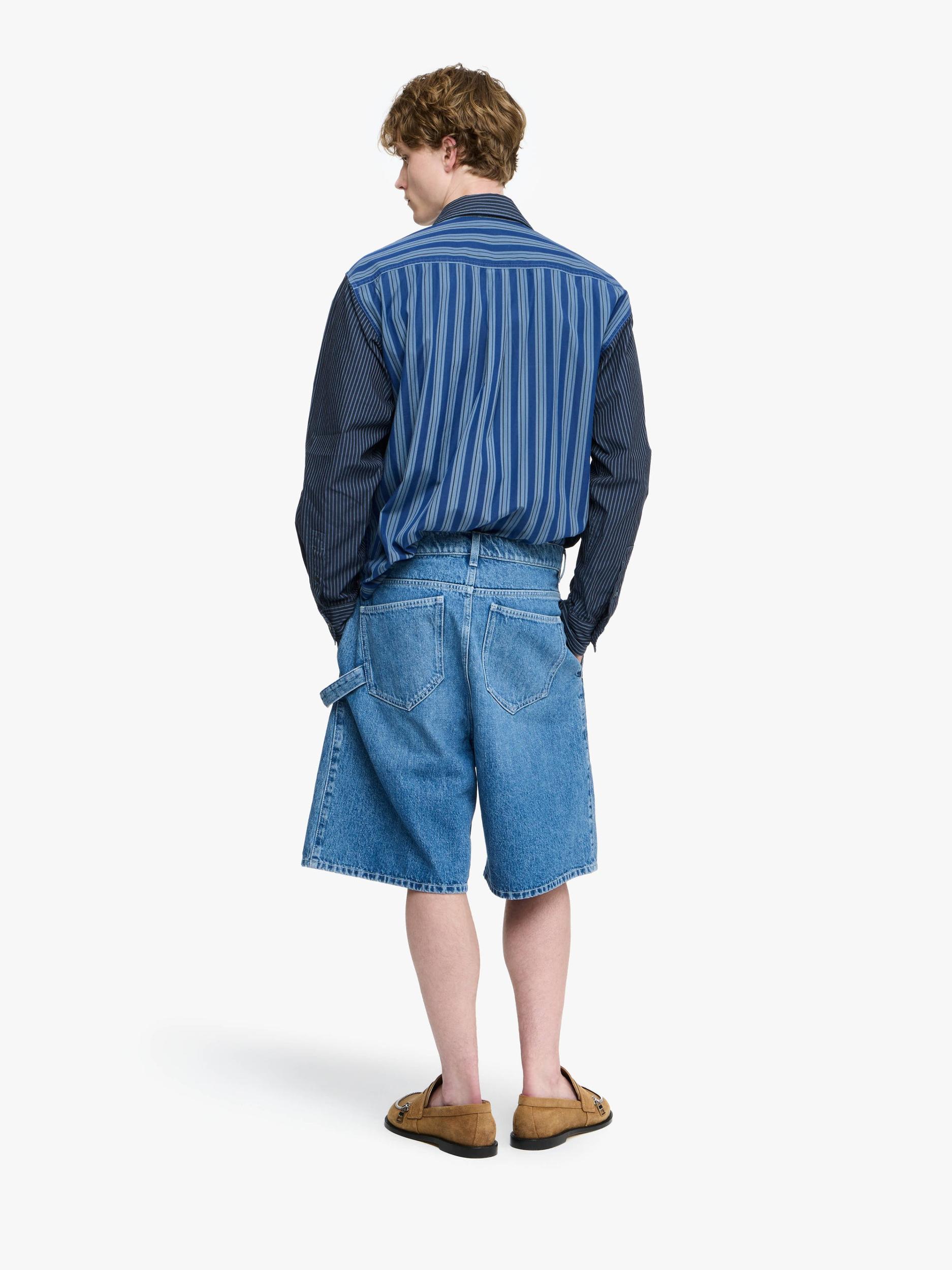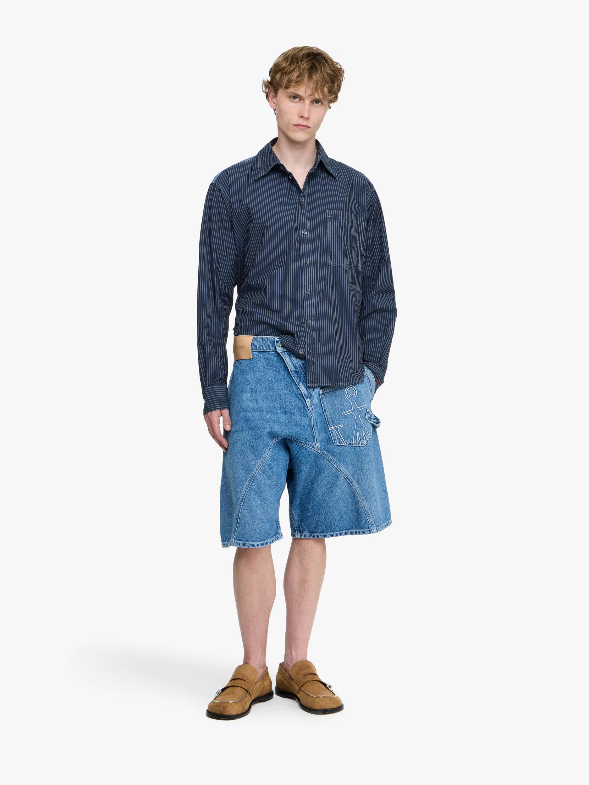 Denim shorts with twisted silhouette Wide leg Curved seams Low waistband Side tab Front patch pocket with contrasting Anchor profile stitch Logo embossed leather patch Relaxed fit - take your usual size