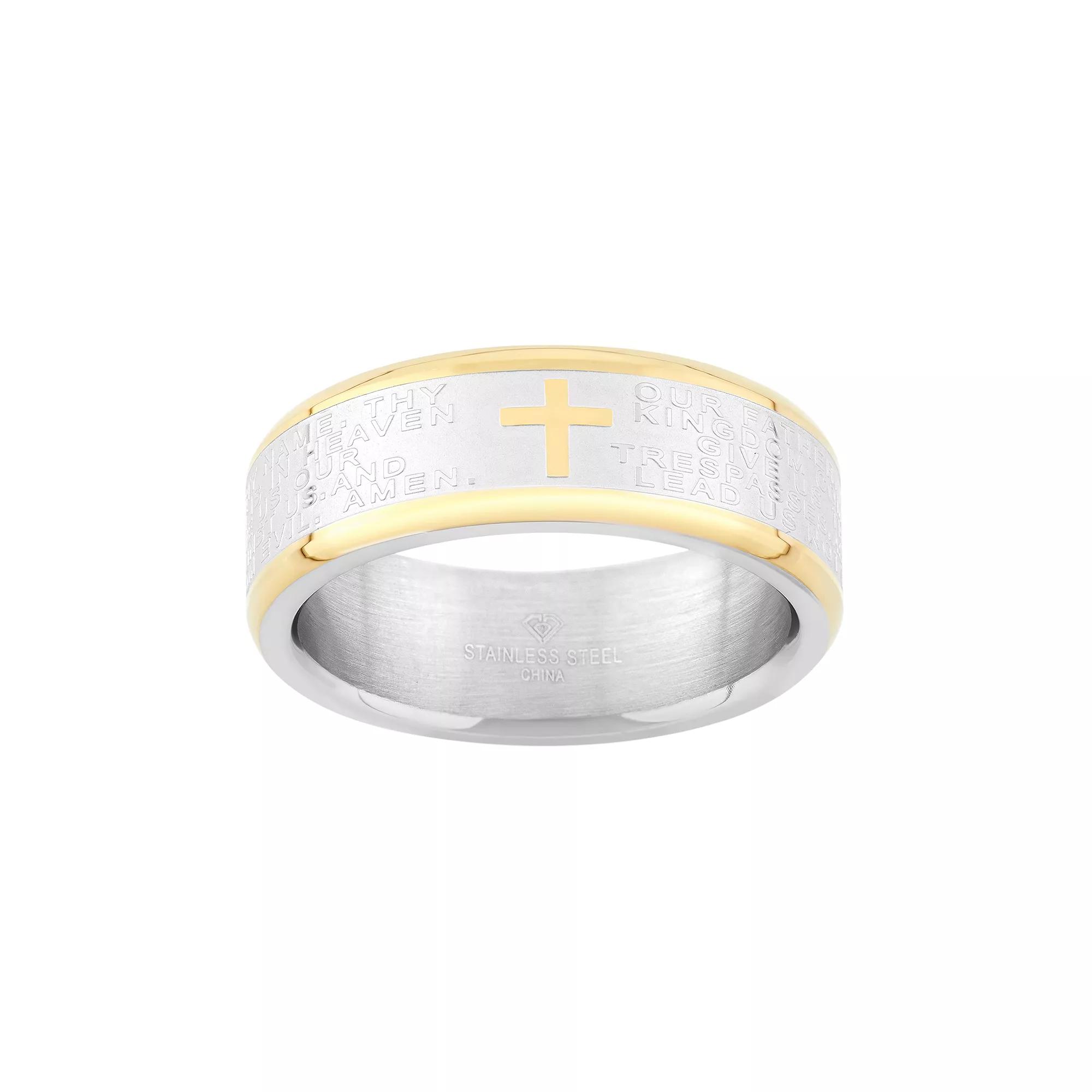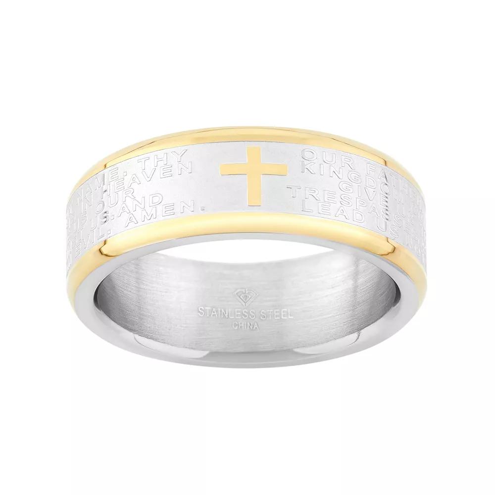 Keep God and your faith at the forefront of your marriage when you wear this handsome men's "The Lord's Prayer" wedding band.RING DETAILS Width: 8 mm Metal: stainless steel, yellow ion-plated stainless steel Features: comfort-fit band Size: 10. Color: Silver. Gender: male. Age Group: adult.