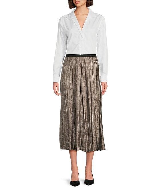 tyler boe Cara Crushed Metallic Pleated A-Line Pull-On Midi Skirt
