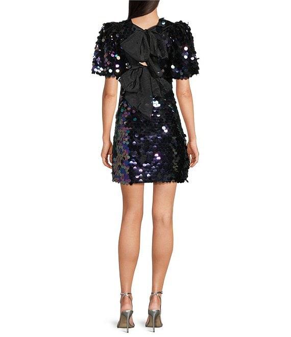 tyler boe Savannah Paillette Sequin Round Neck Short Puff Sleeve Bow Back Dress