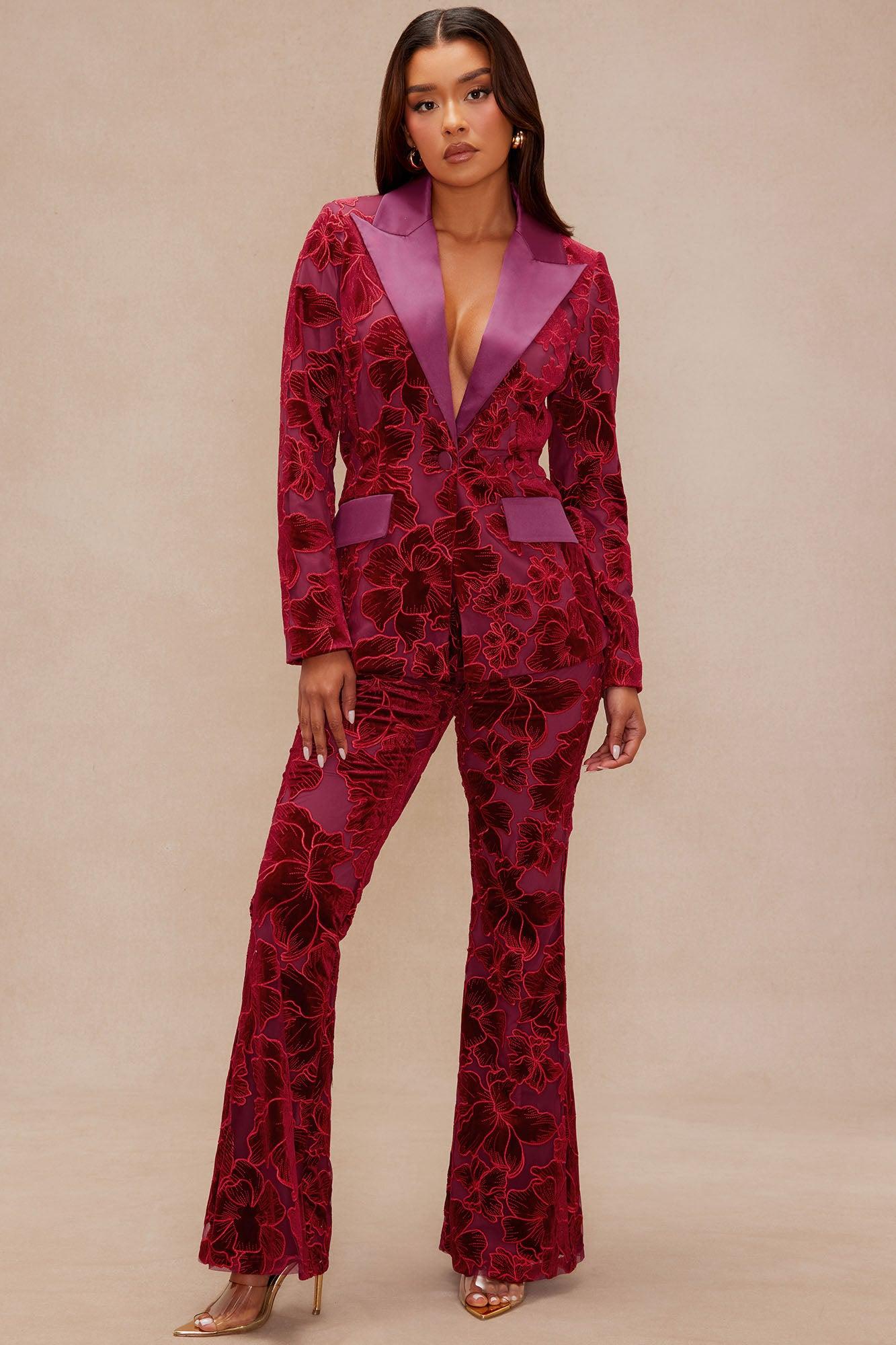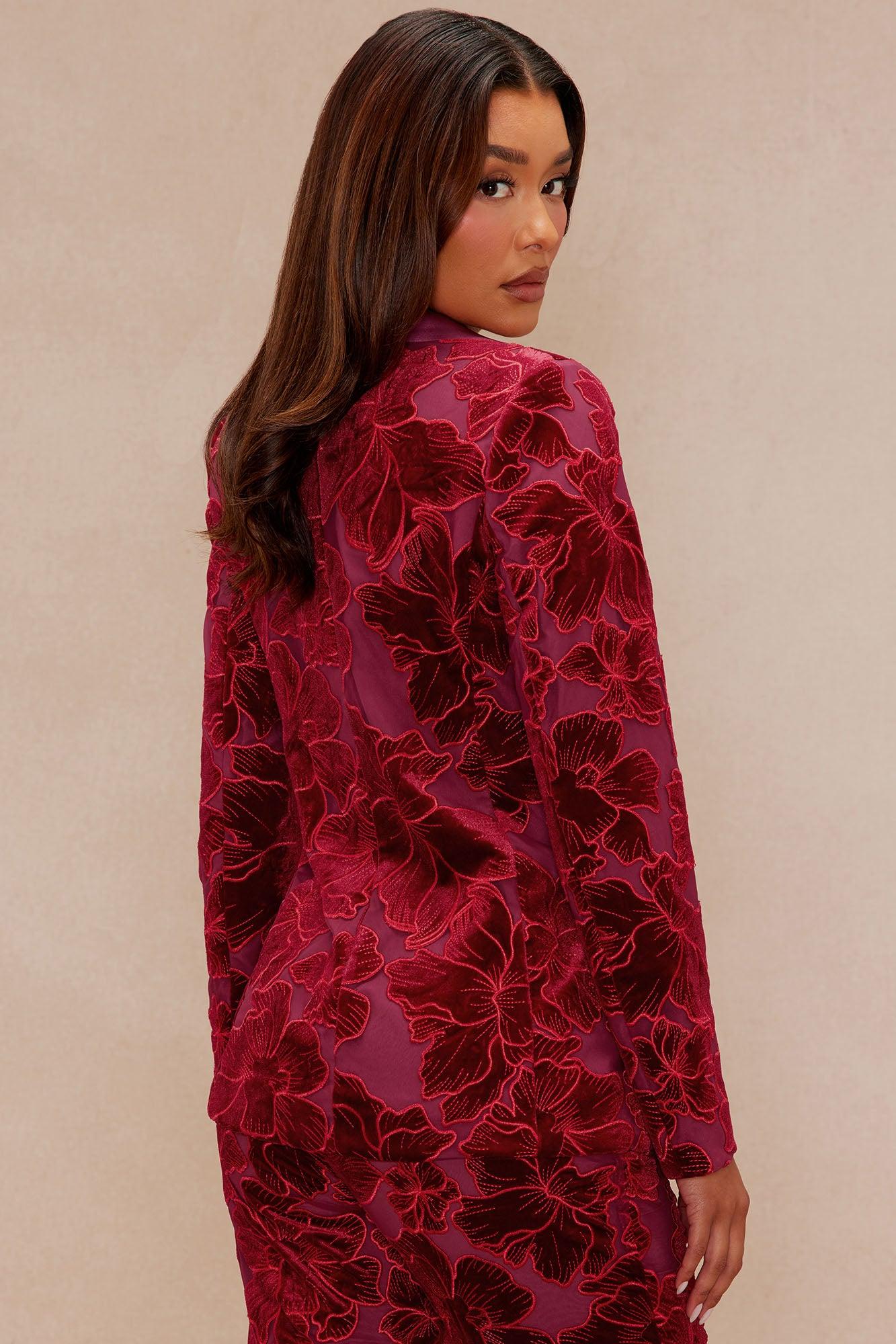 Available In Burgundy. Blazer Long Sleeve Shoulder Pads Collared Velvet Embroidery Faux Pockets Front Button Closure Lined No Stretch Disclaimer : Due To The Embroidery Placement , Each Garment Is Unique. Shell: 100% Nylon Lining: 100% Polyester Imported California Proposition 65WARNING: Cancer and Reproductive Harm - www.P65Warnings.ca.gov.