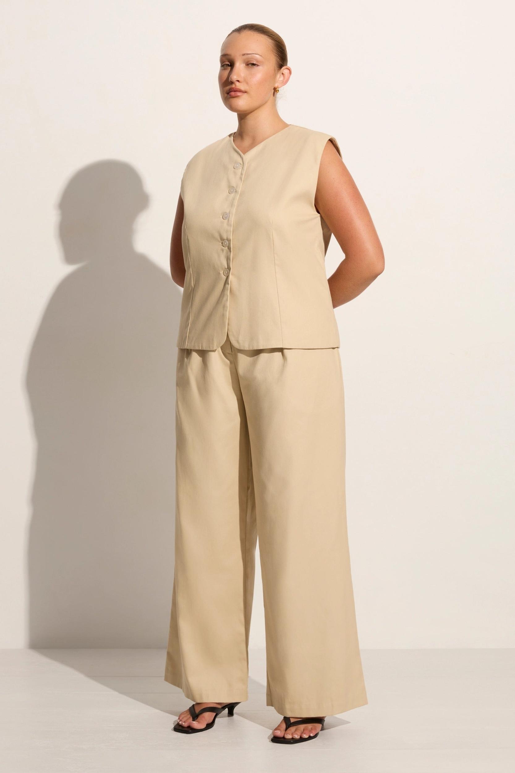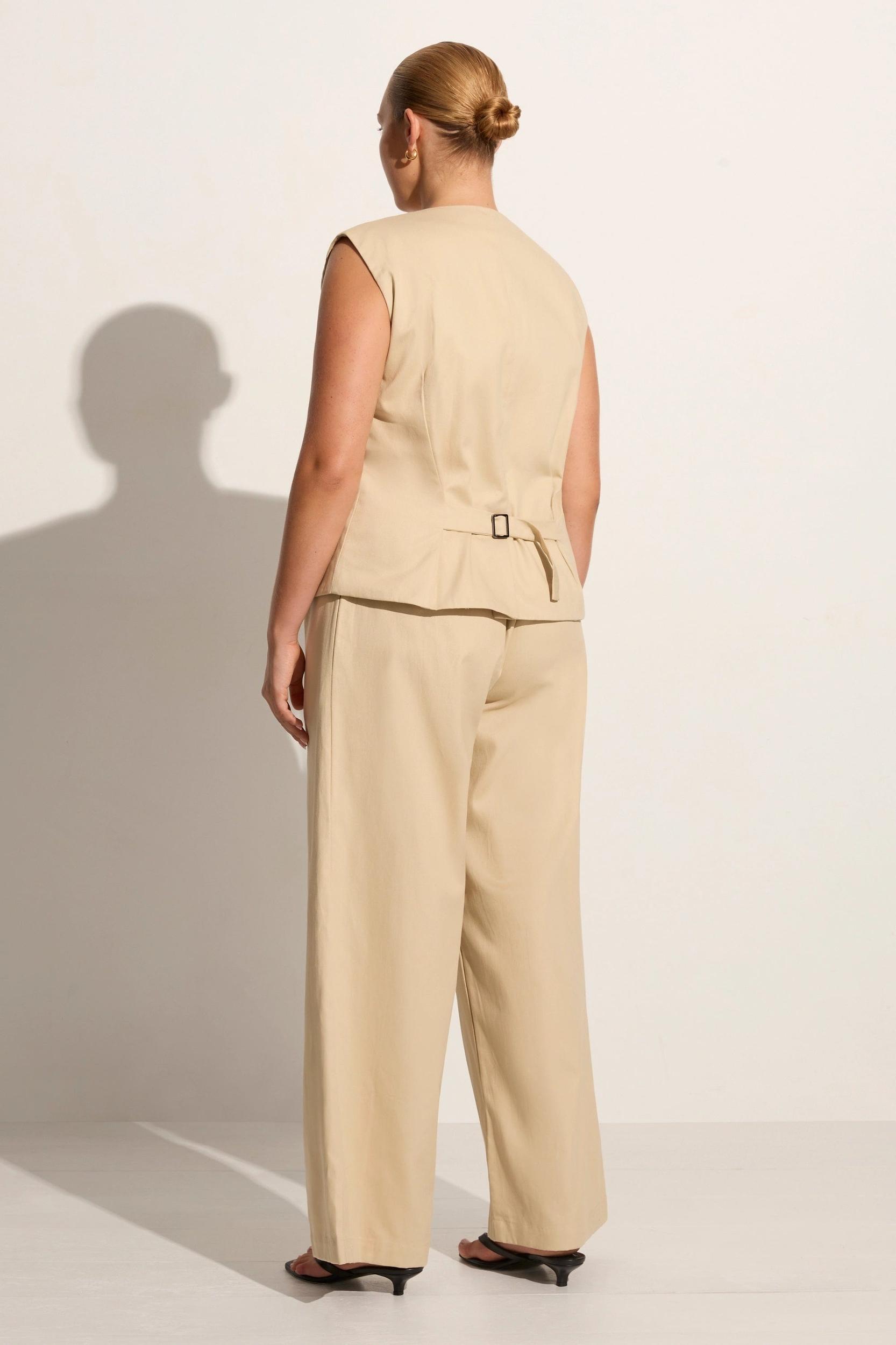 Tailored in cotton twill, the Udine Pants in Bleached Sand are a wardrobe staple you'll gravitate towards for seasons to come. It features a high-rise waist, wide leg silhouette, front pleats and a wide waistband with an elasticated back for easy wear. Pair it with the Delfina Vest for a two piece tailored set.